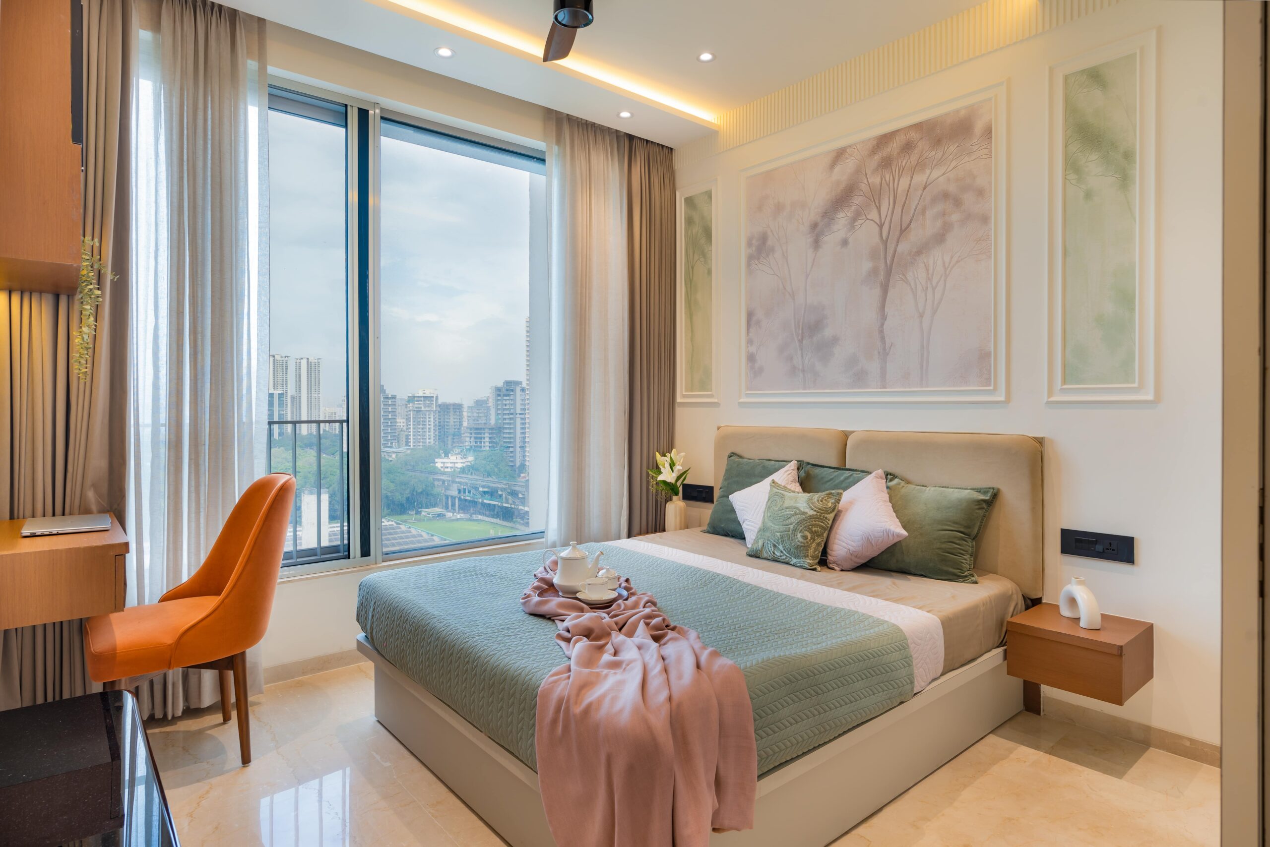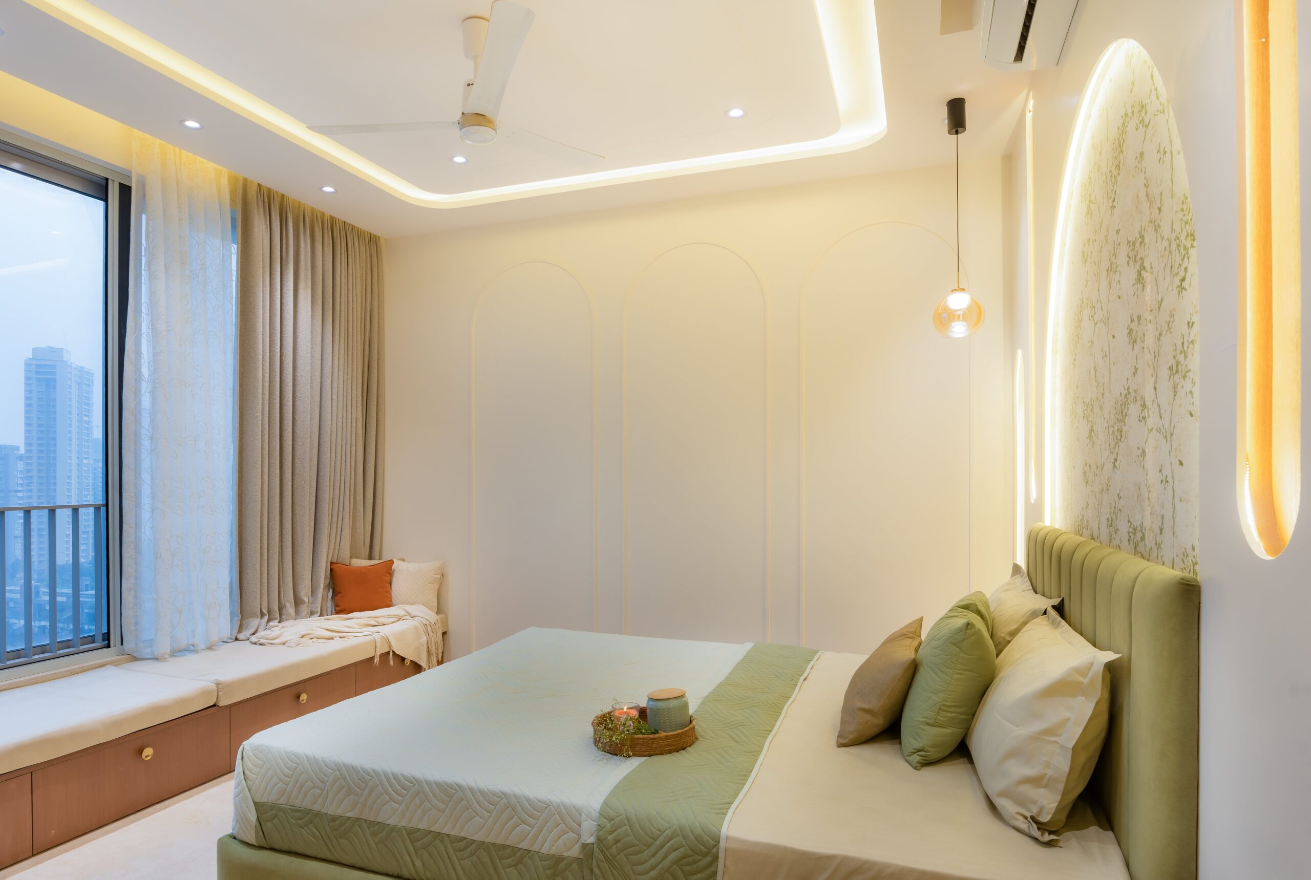 A cozy window-side seating area becomes the perfect nook for reading or morning tea, enhanced by beige and white curtains that filter light beautifully. The U-shaped mirror paired with a sleek dressing table completes the room, adding to its elegance and functionality.