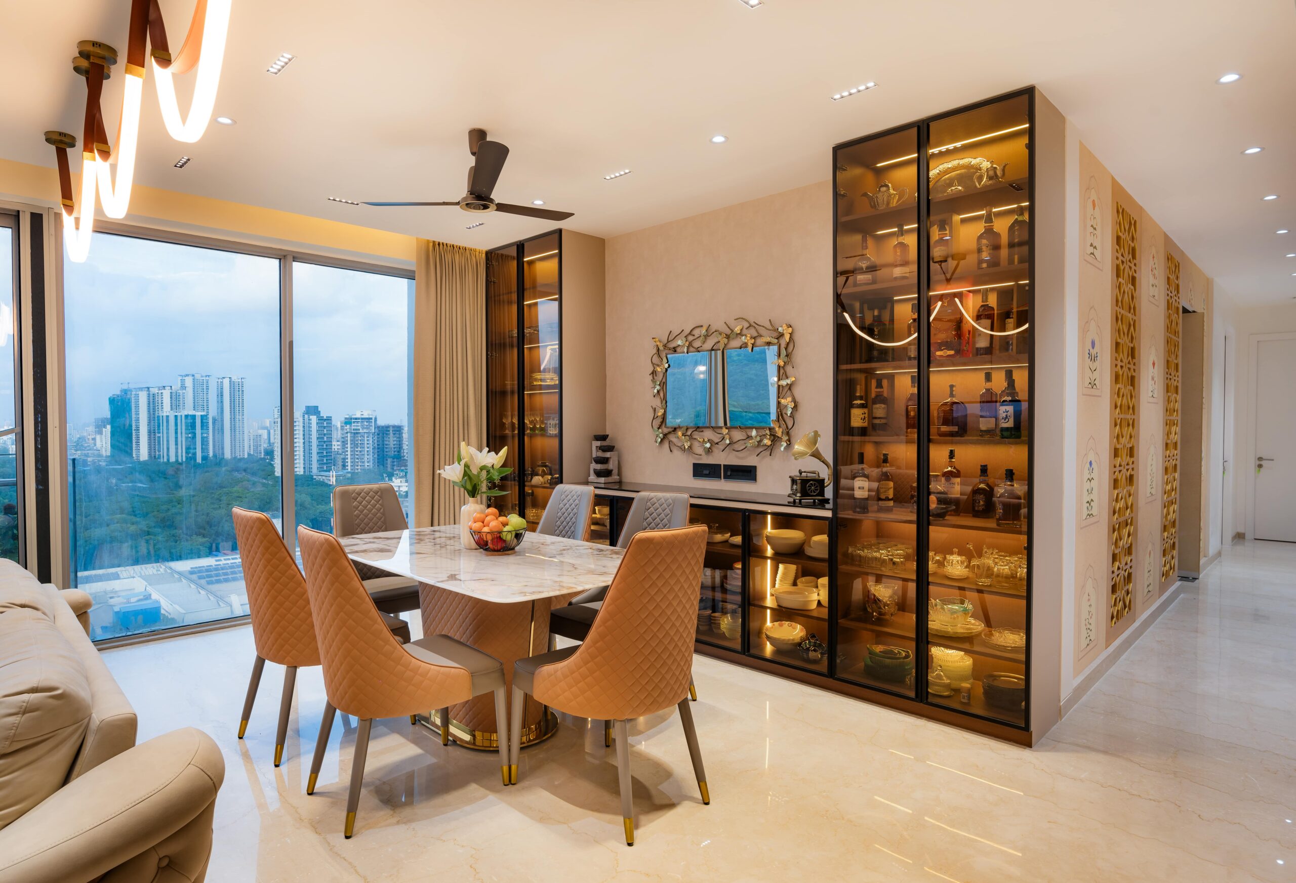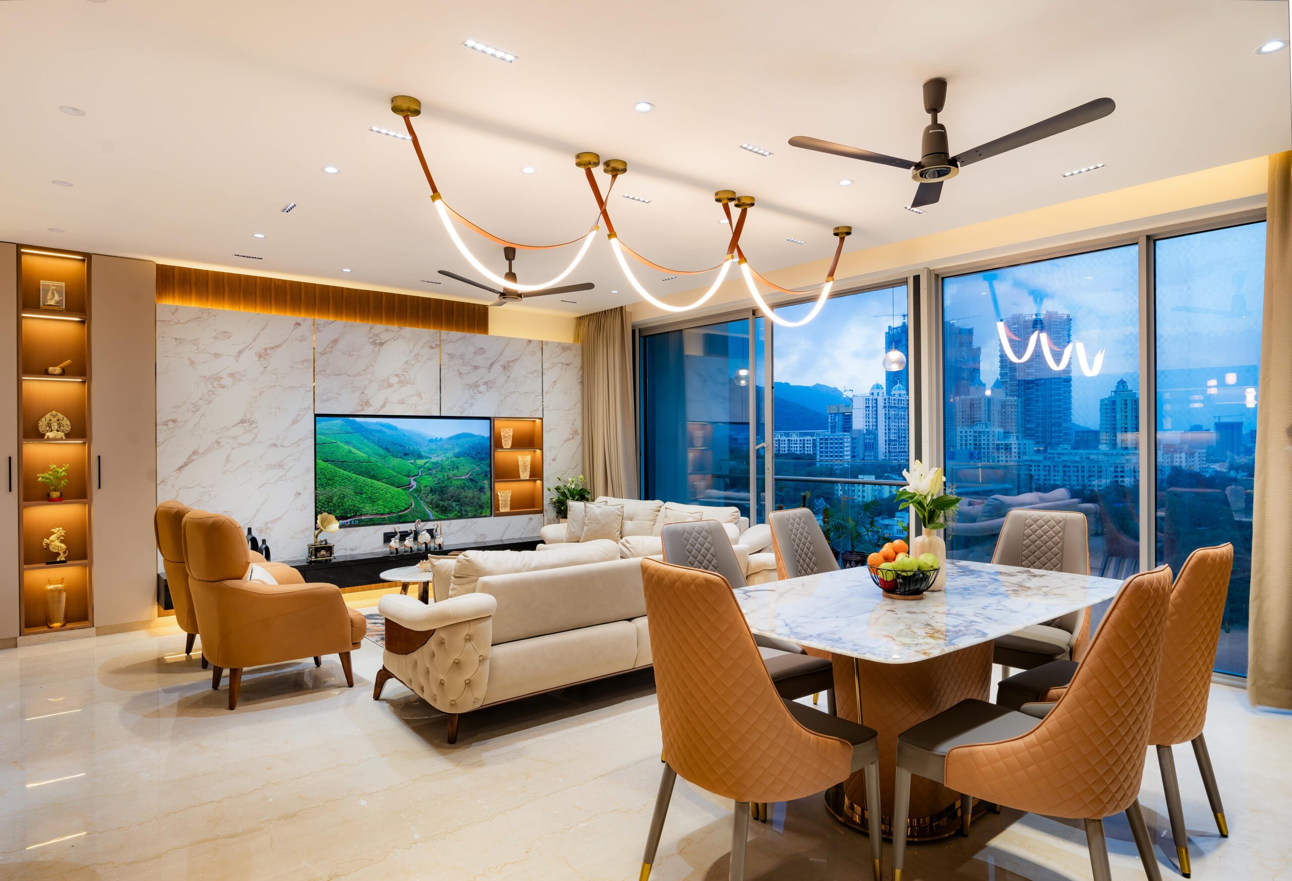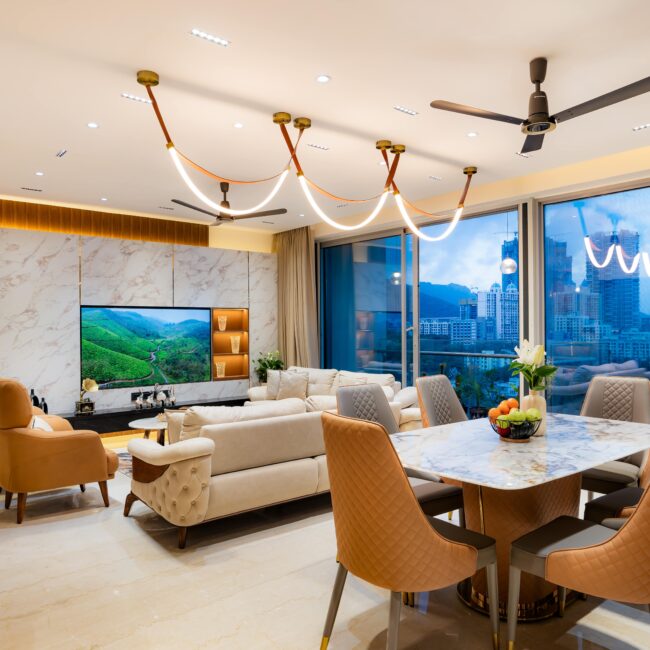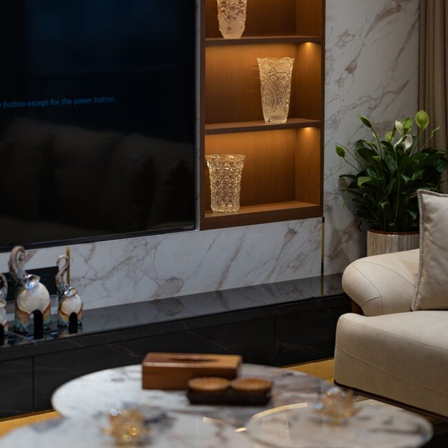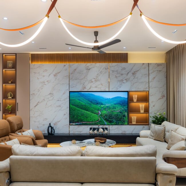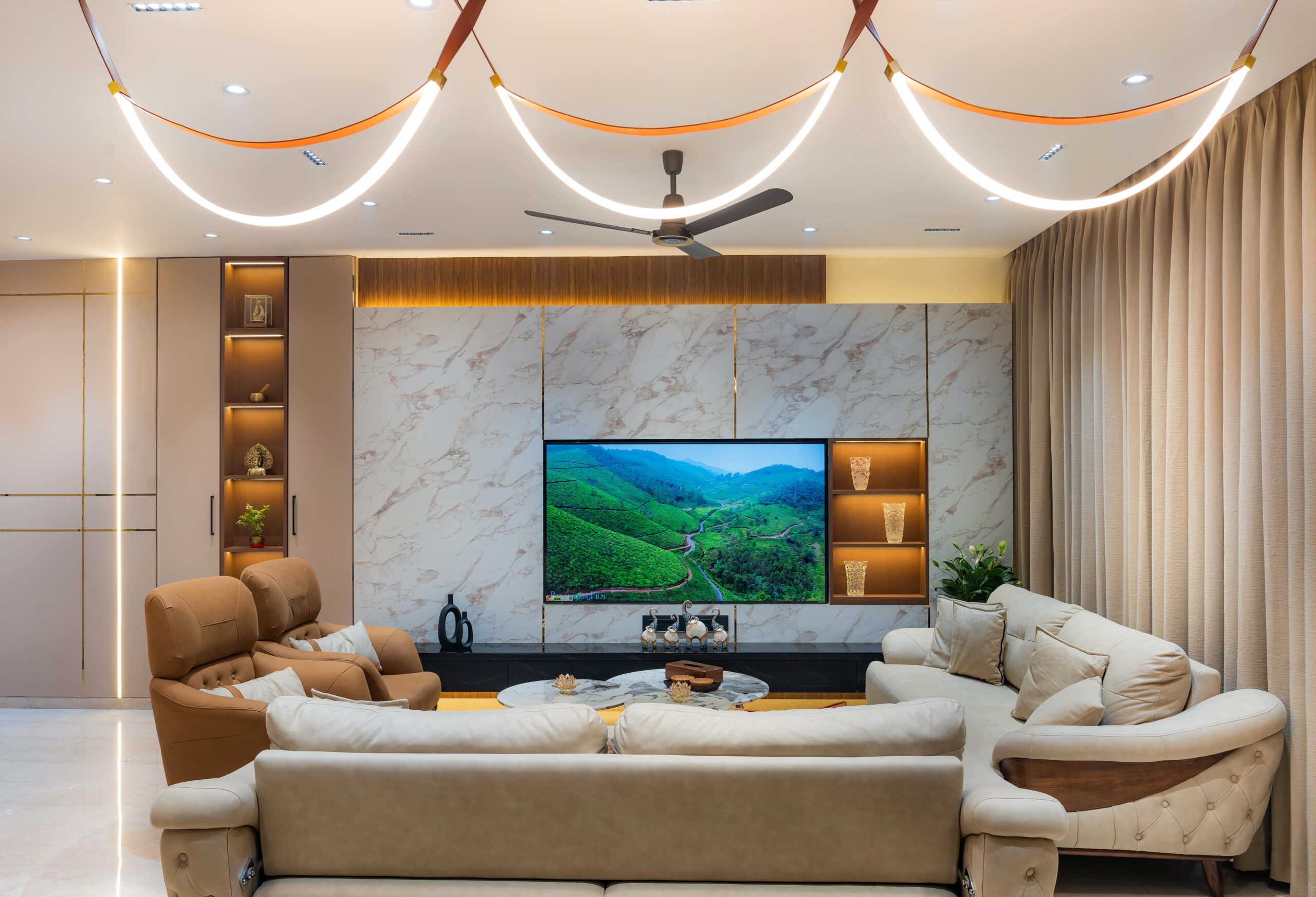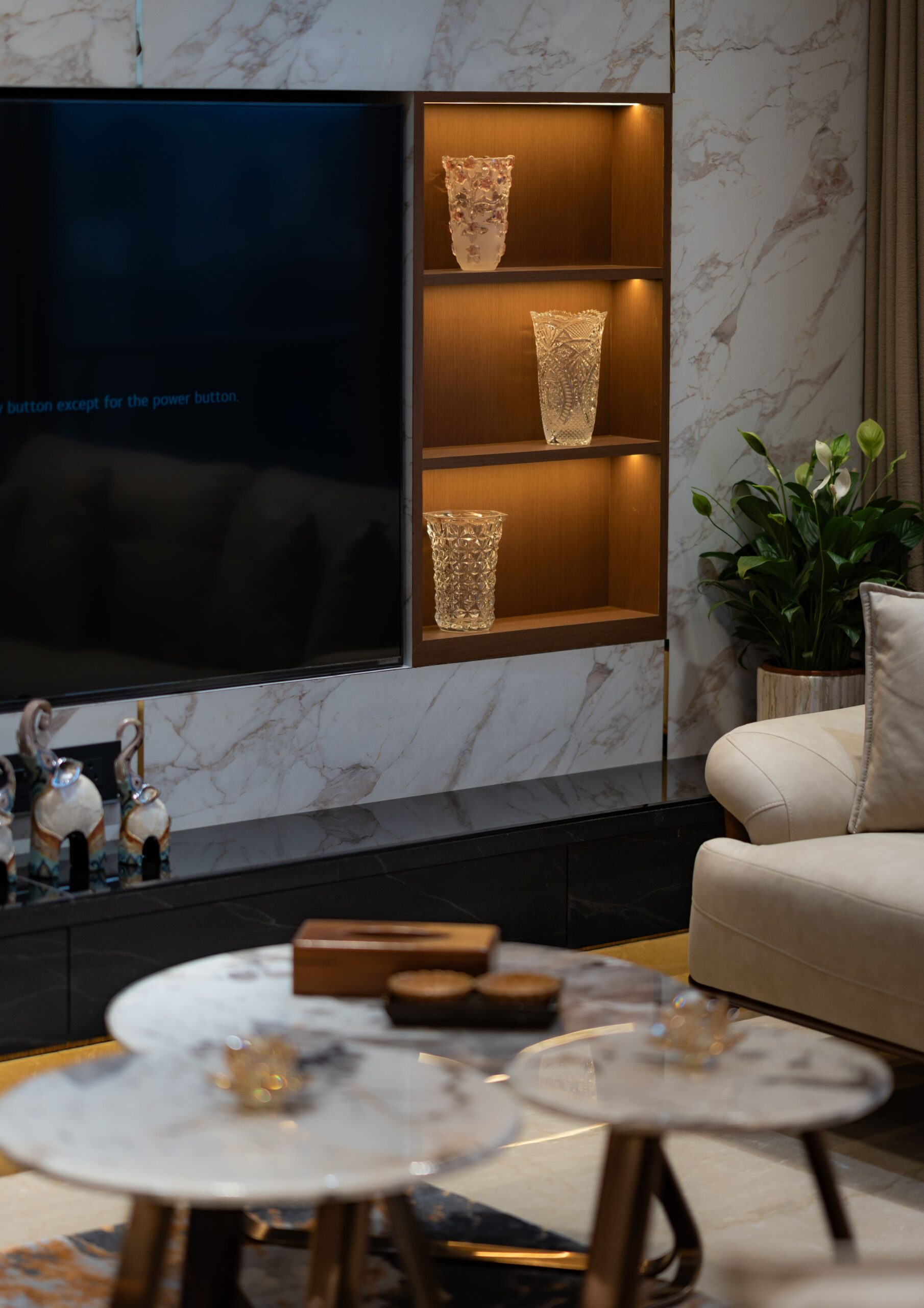 The bar area features stylish hanging lights, creating a warm, inviting ambience—perfect for hosting. The beige furniture offers a neutral, elegant base, while the marble work behind the TV unit acts as a stunning focal point in the living room.