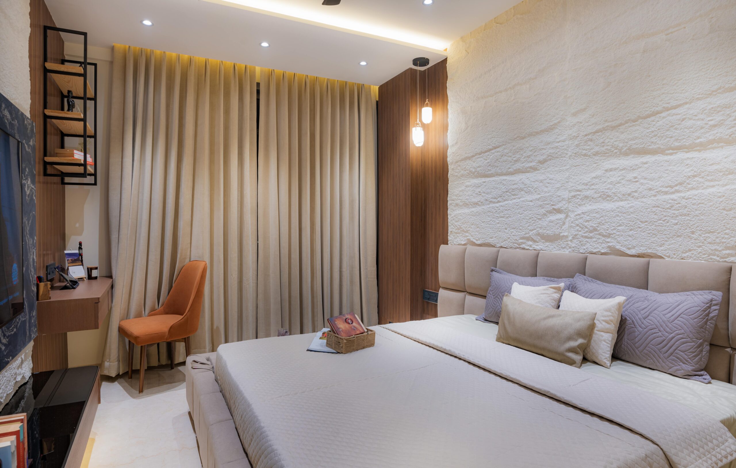 This bedroom leans into soft sophistication with a beige bed and matching curtains that create a soothing atmosphere.