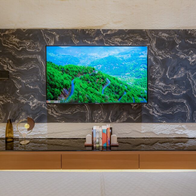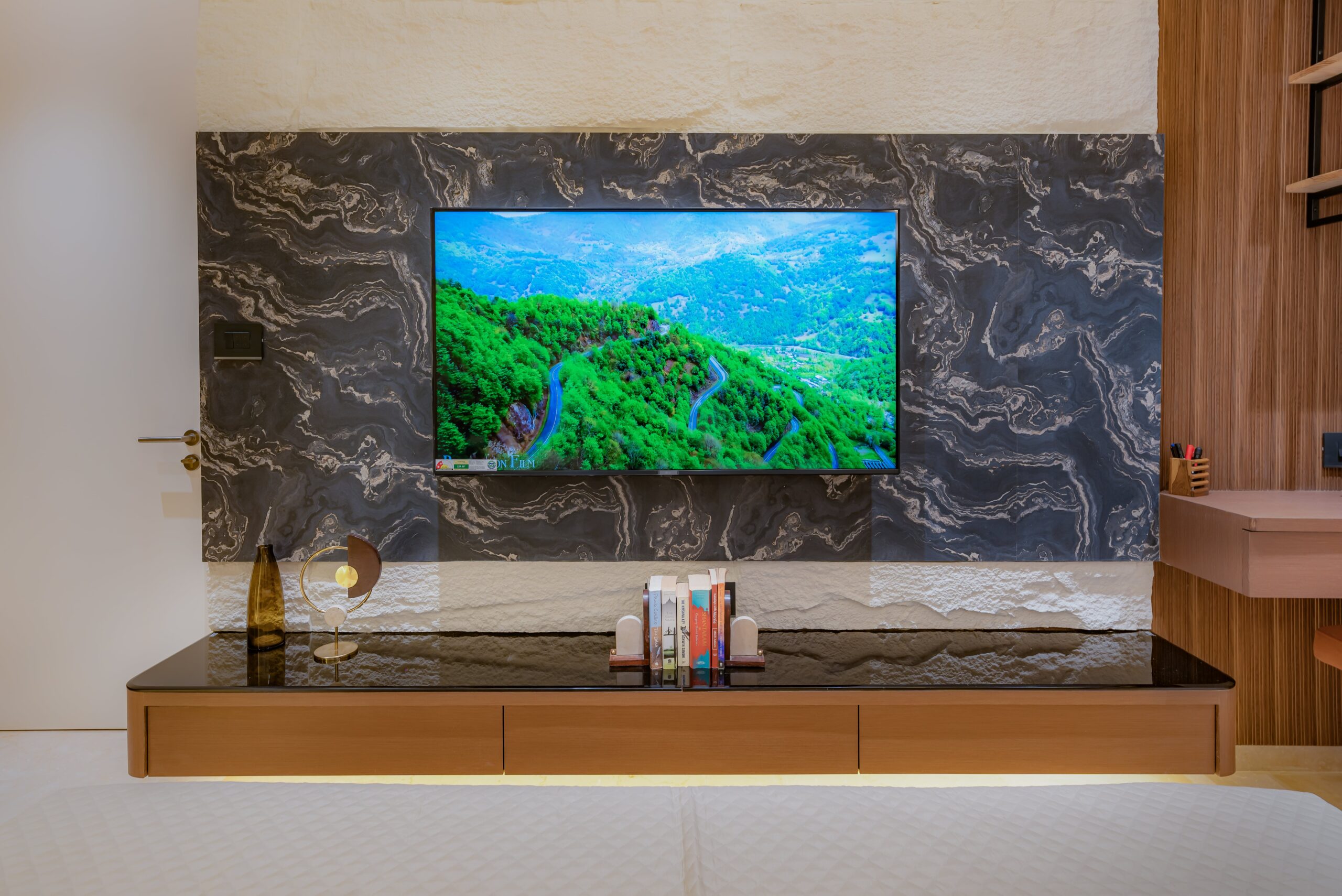 A highlight of the room is the intricate CNC work, adding artistic texture to the walls. The room offers ample storage with glass-front cabinets, blending practicality with aesthetics.