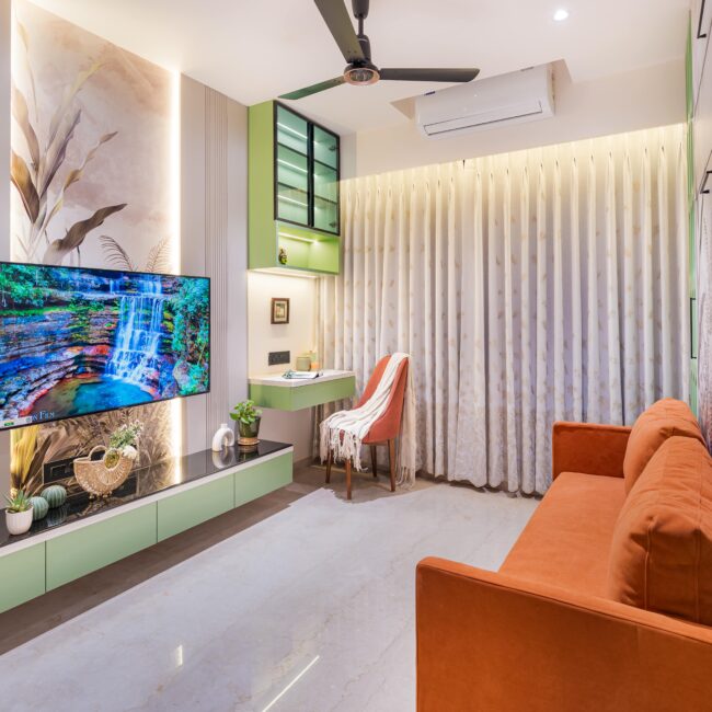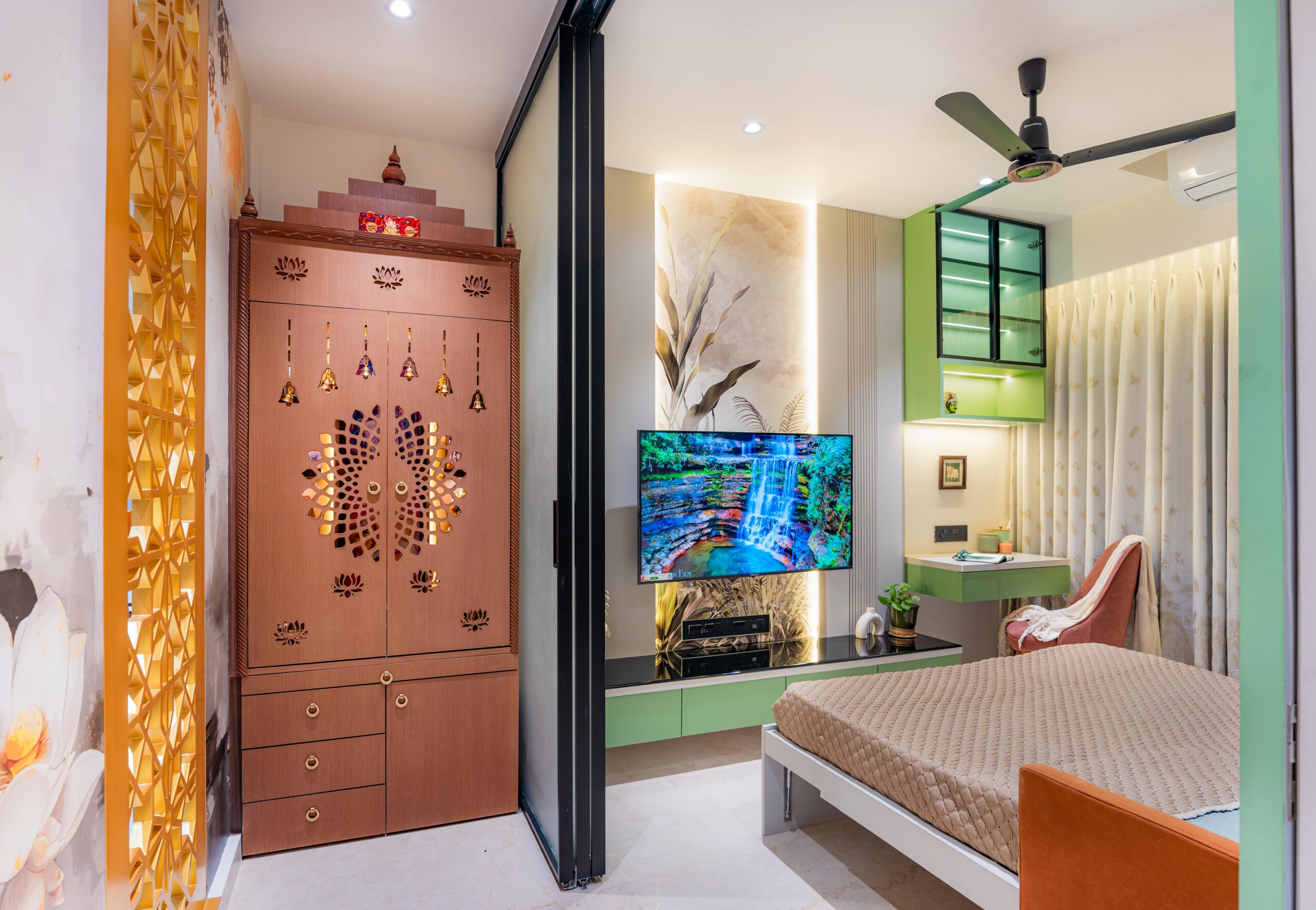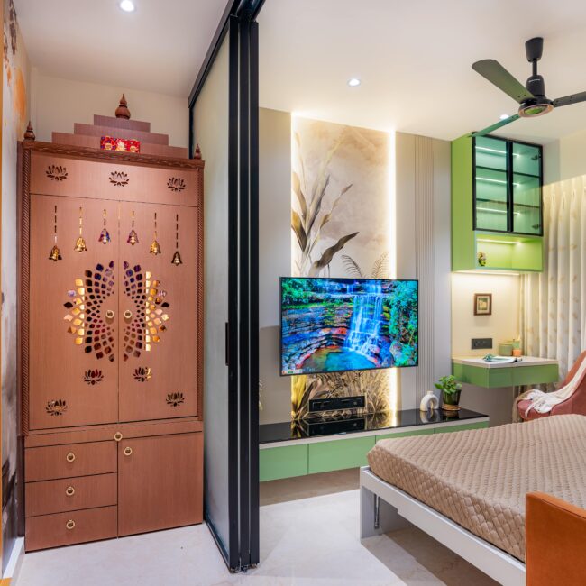 An extra room in the home serves two functions—a cozy TV unit area and a serene mandir with sliding doors. The mandir design keeps the space peaceful and sacred while maintaining a clean, clutter-free look.