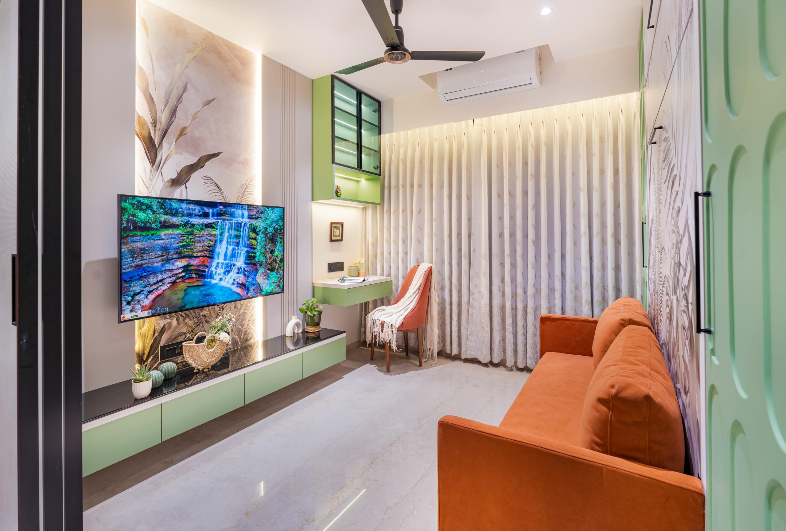 The workstation in bright orange energizes the space, making it perfect for productivity. In contrast, the pastel green bed grounds the room, balancing vibrancy with calm.
