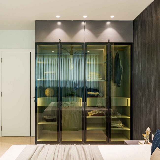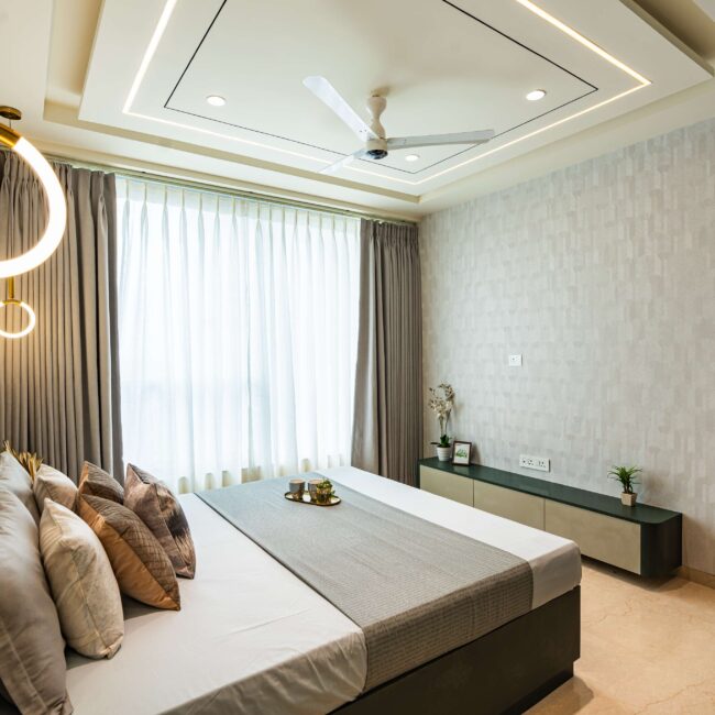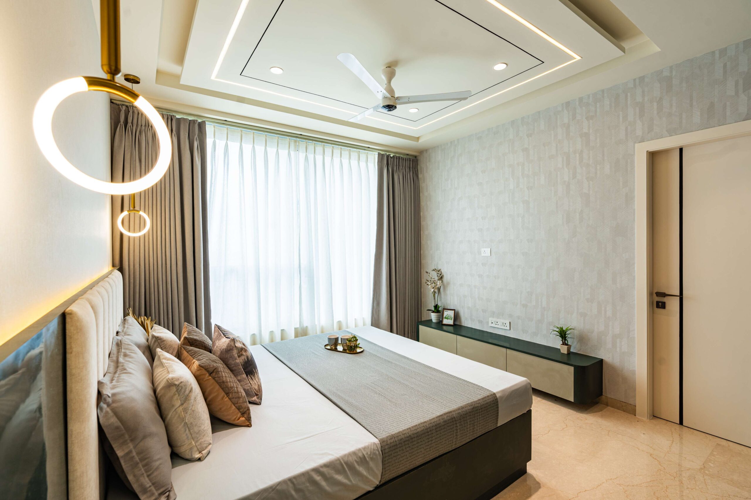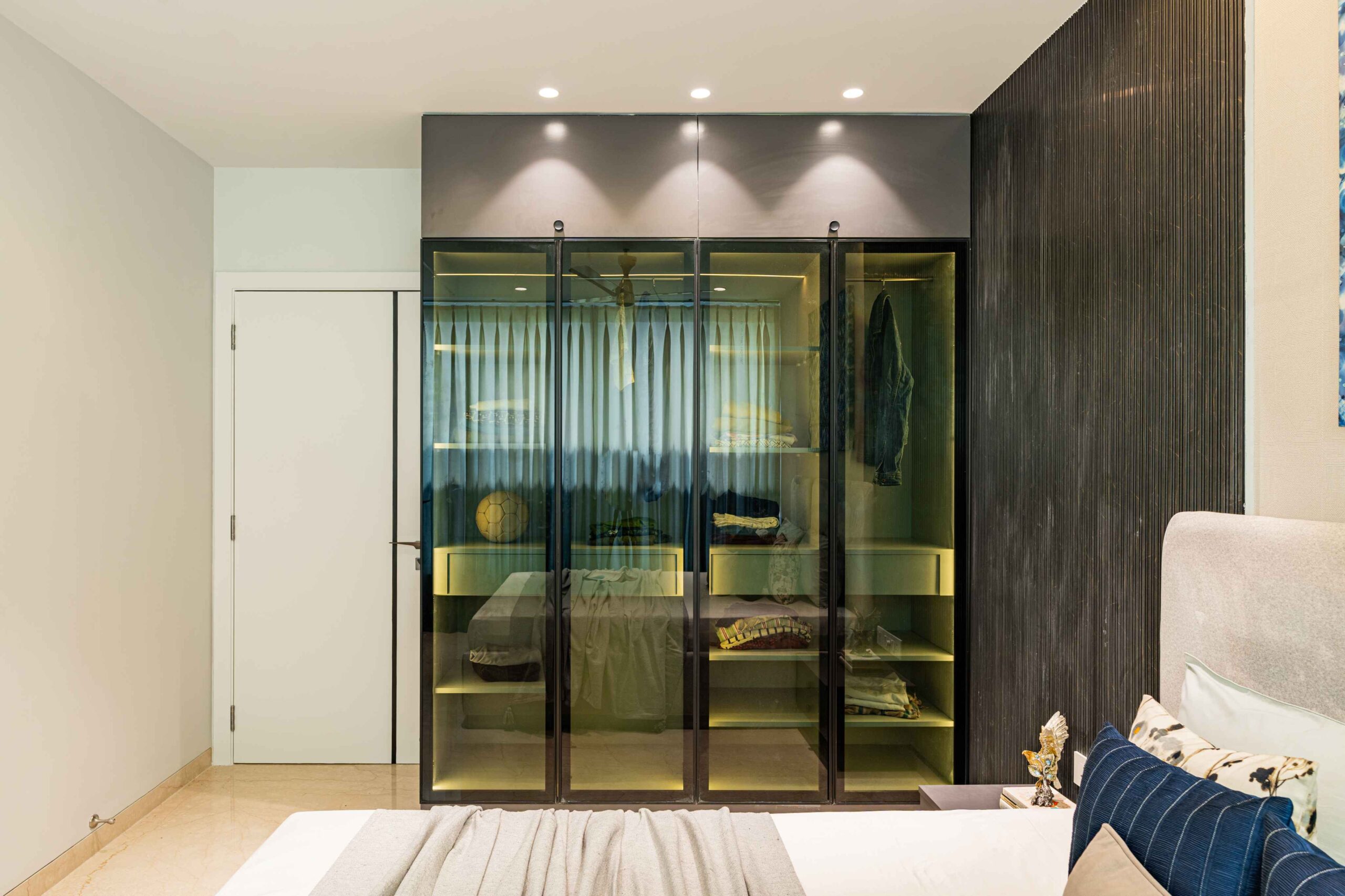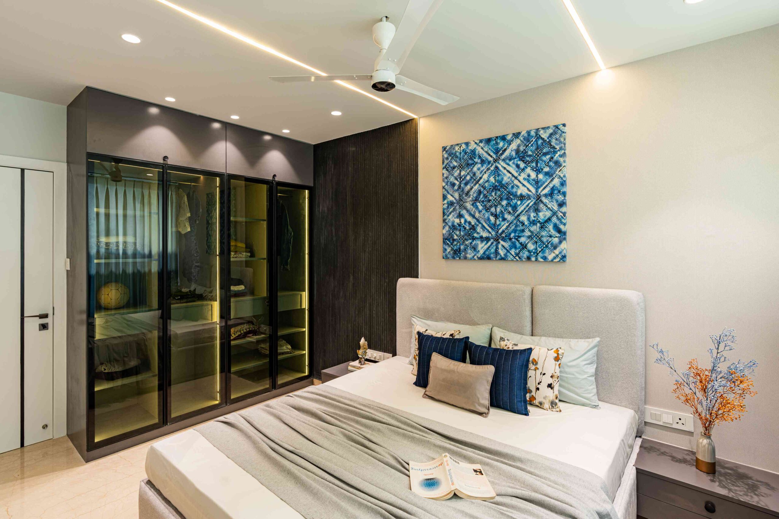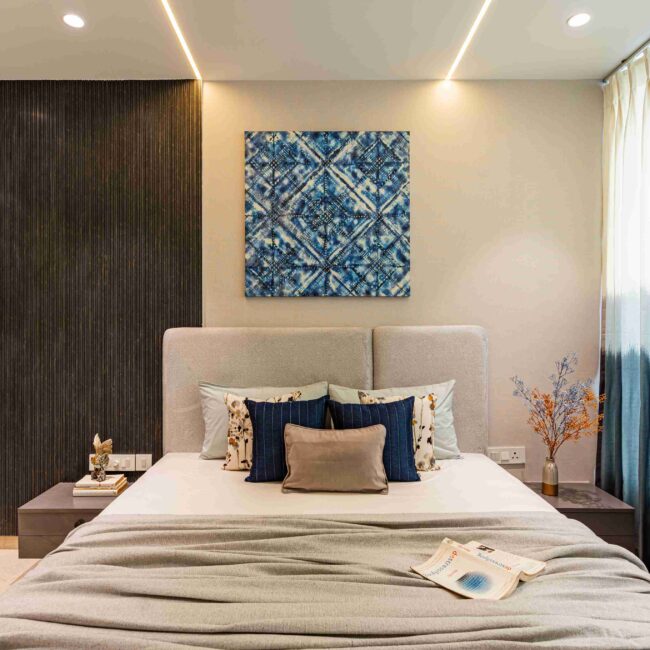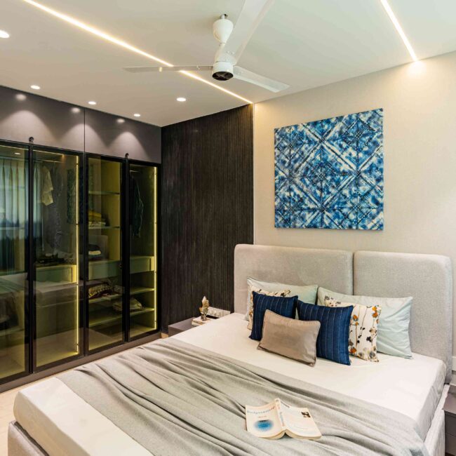 The first bedroom exudes understated luxury. A beige bed set against ivory walls creates a soothing backdrop, while a blue artwork adds a touch of contrast and personality. Wooden elements introduce warmth, and a glass-door closet enhances openness and light. The subtle play of track and cove lighting completes the ambience, blending function with soft elegance.