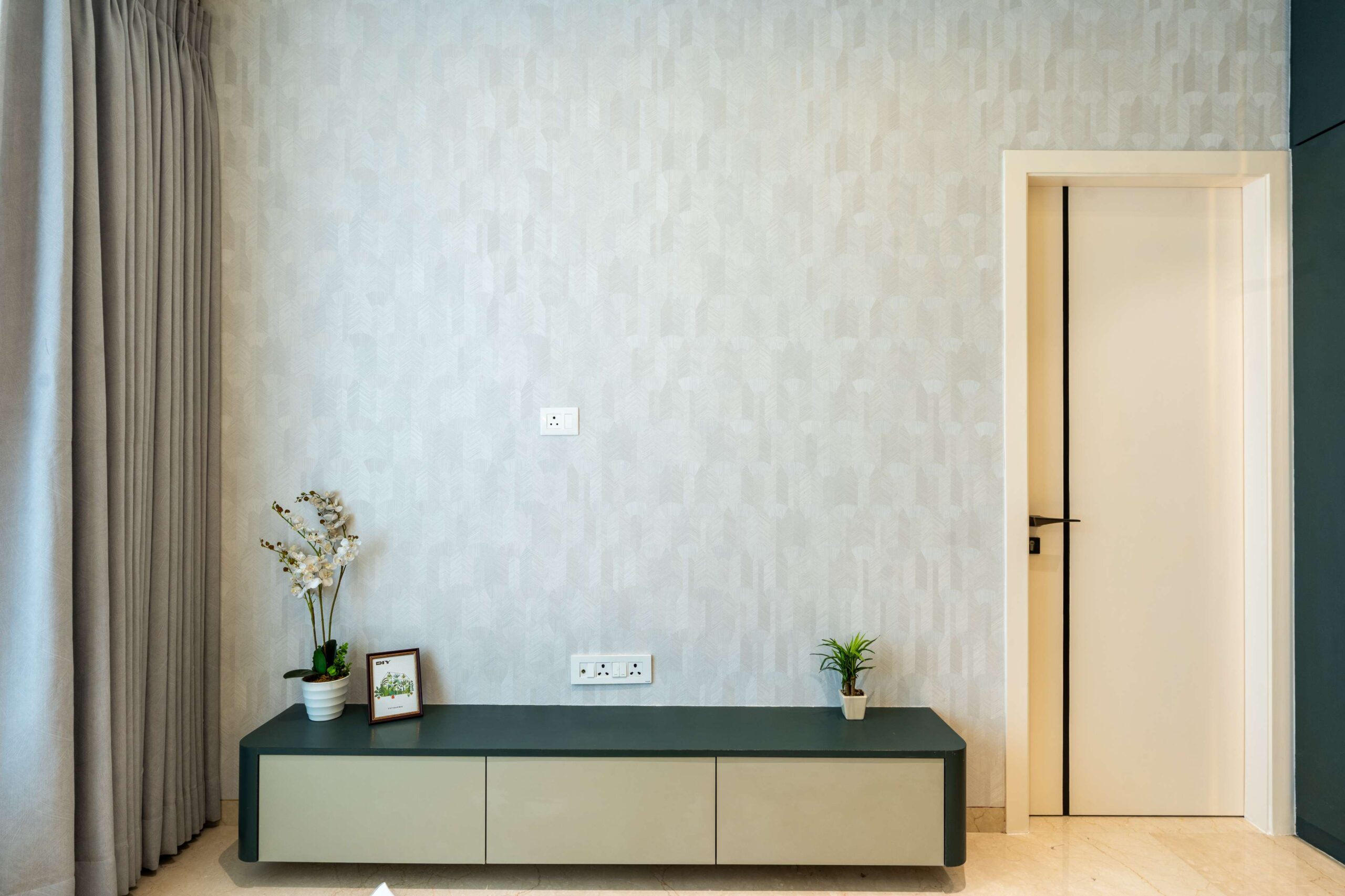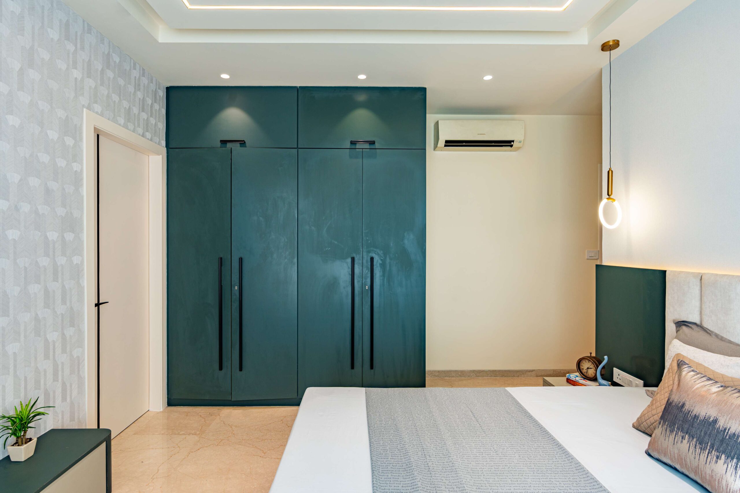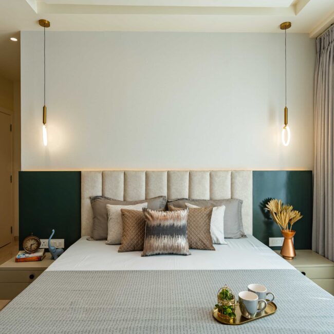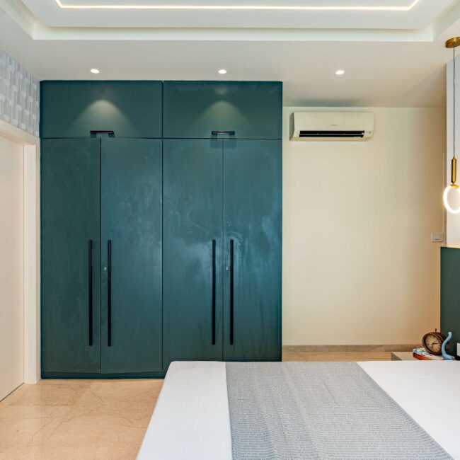 The second bedroom, on the other hand, takes on a deeper tone. Ivory walls provide a neutral canvas for dark green highlights — a sophisticated color that adds depth and calm. A stucco-finished wall adds texture, while hanging lights cast a warm glow, bringing a sense of intimacy and modern charm. The green wardrobe becomes both a statement and a storage solution, seamlessly integrated into the design.