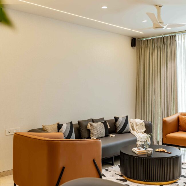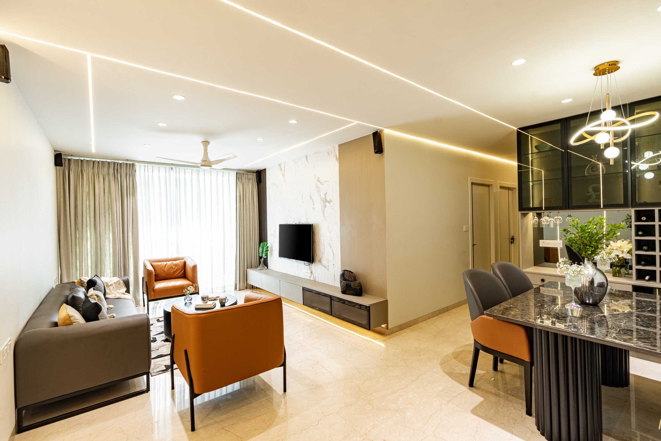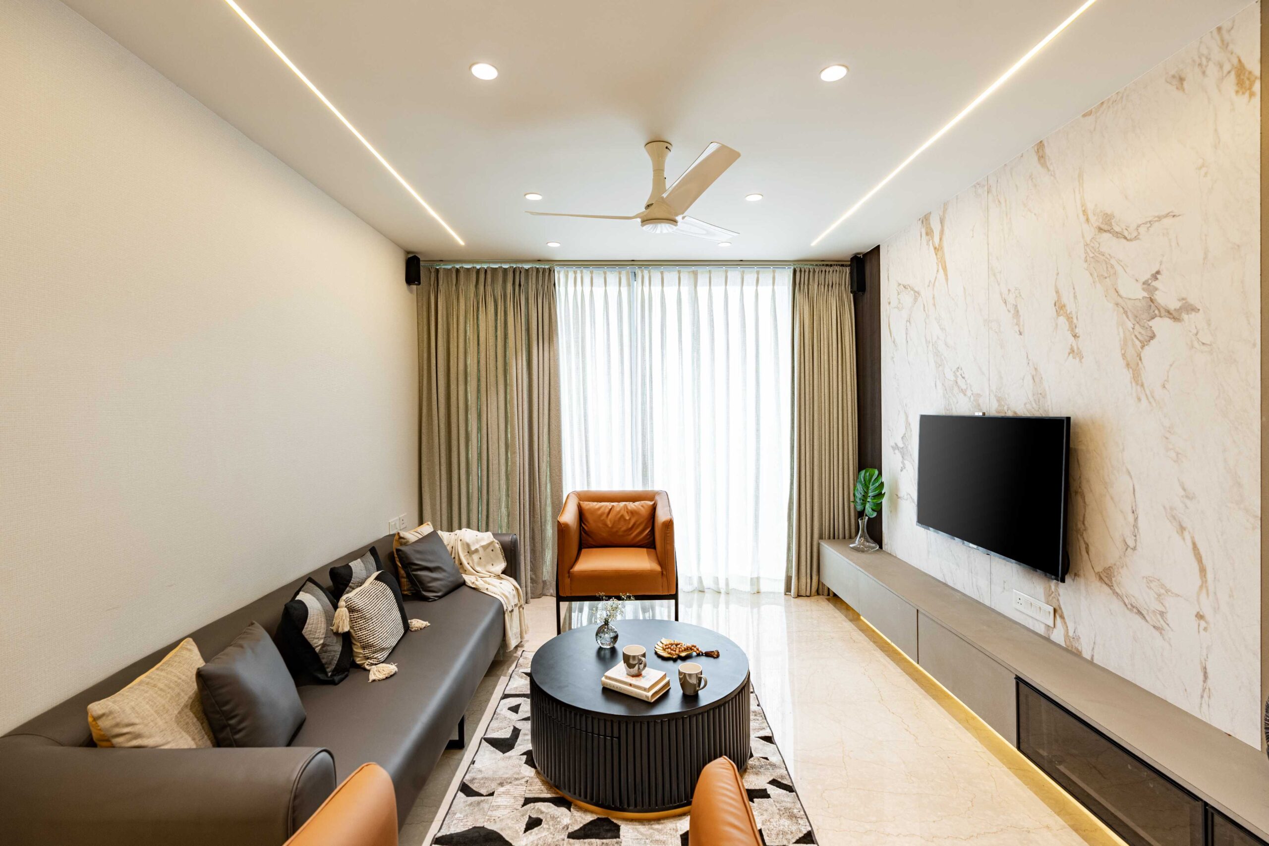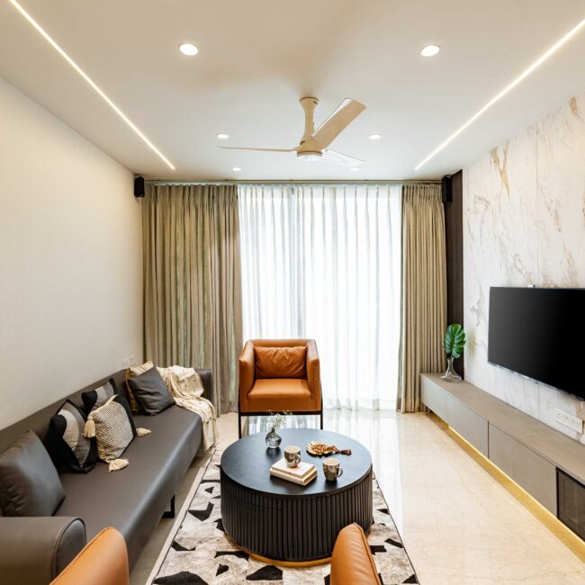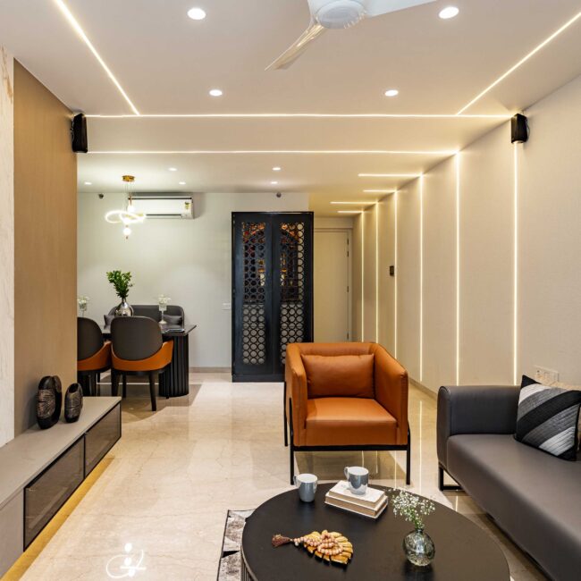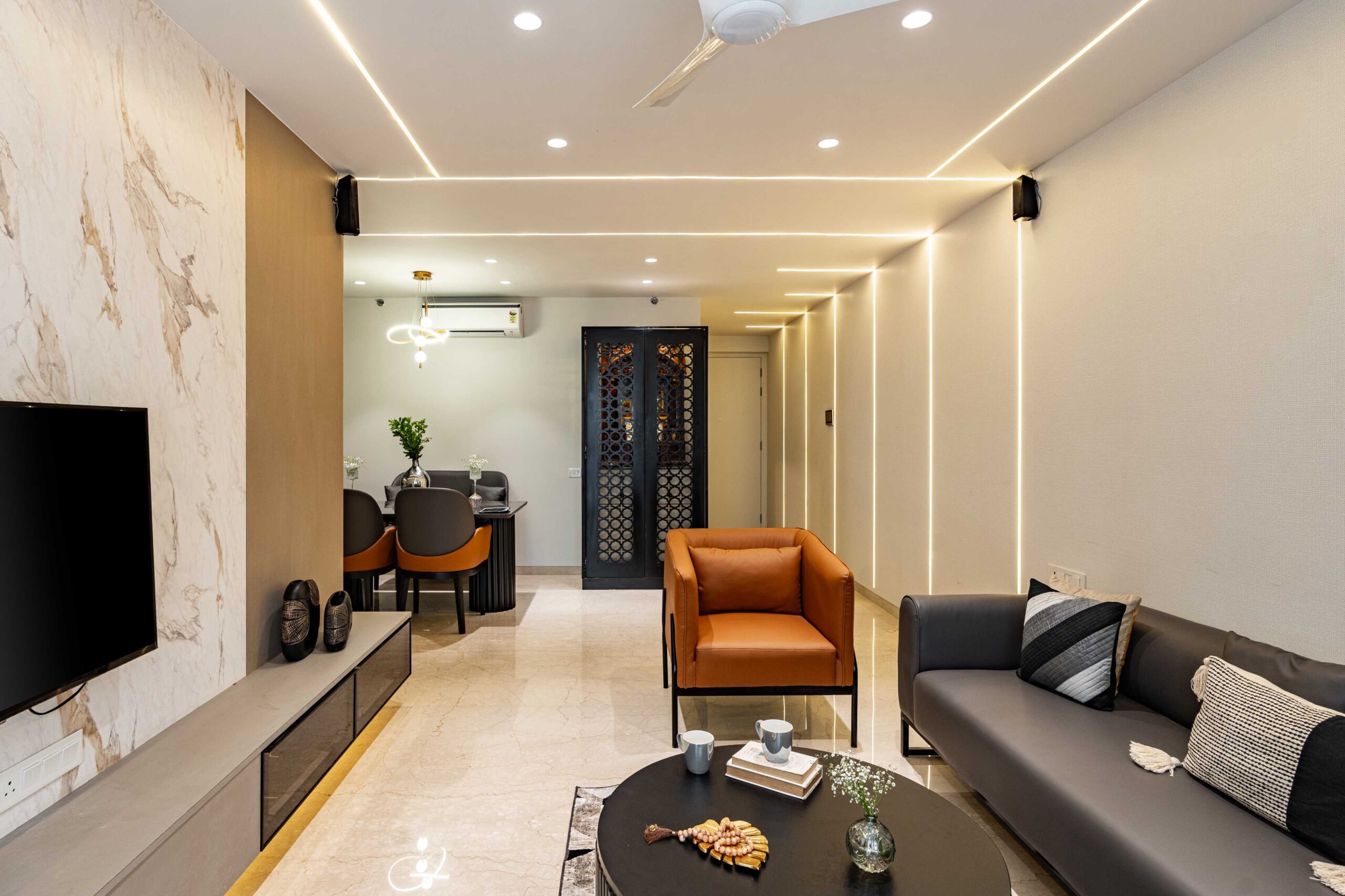 The living room defines the home’s character with a mix of neutral browns, beige, and hints of grey, anchored by an orange sofa that infuses energy into the space. The TV wall in marble adds a layer of opulence, while the track lights highlight key details. A separate mandir unit lends a serene touch, balancing spirituality and style.
