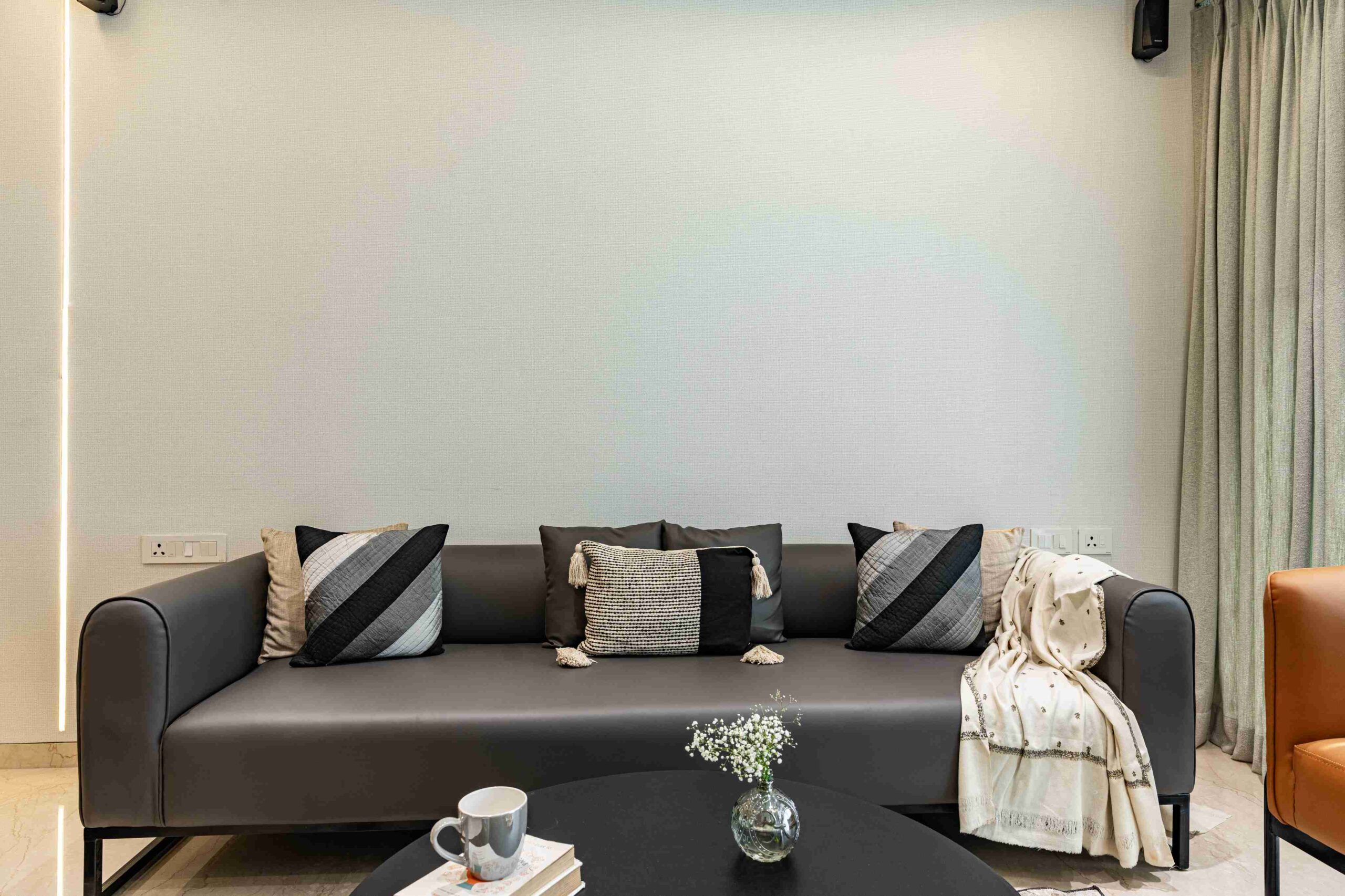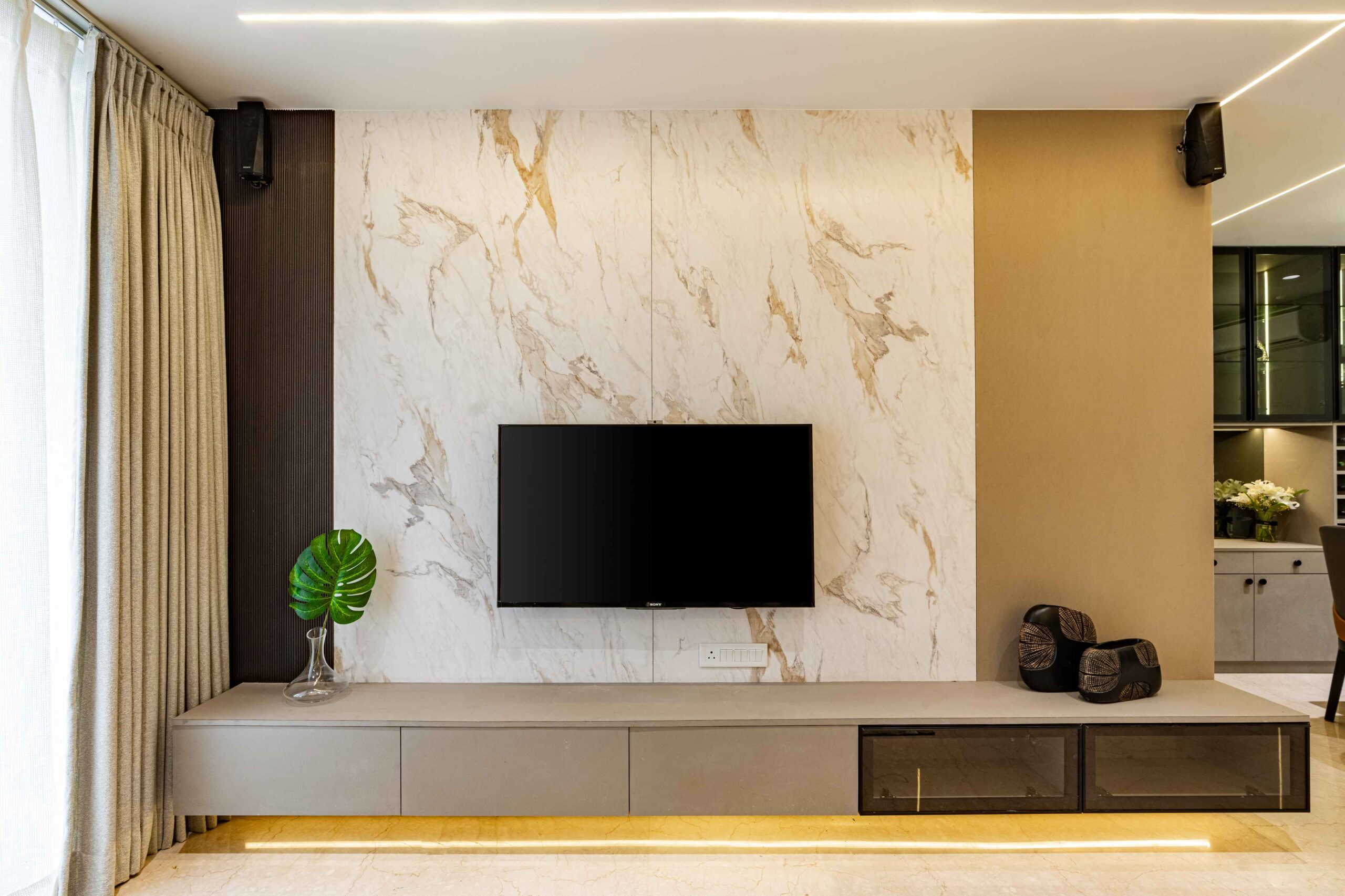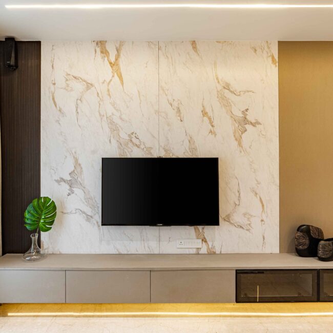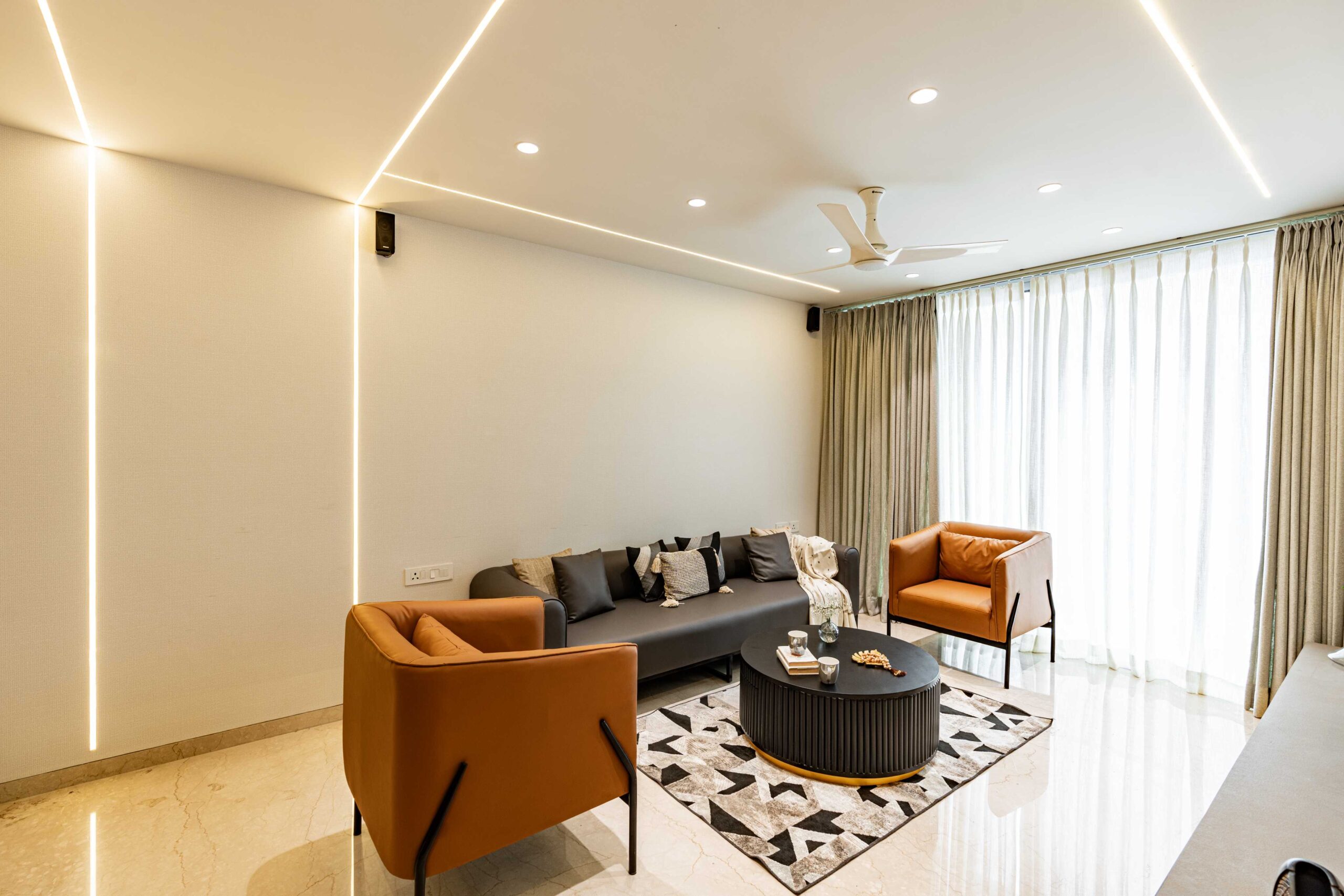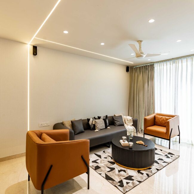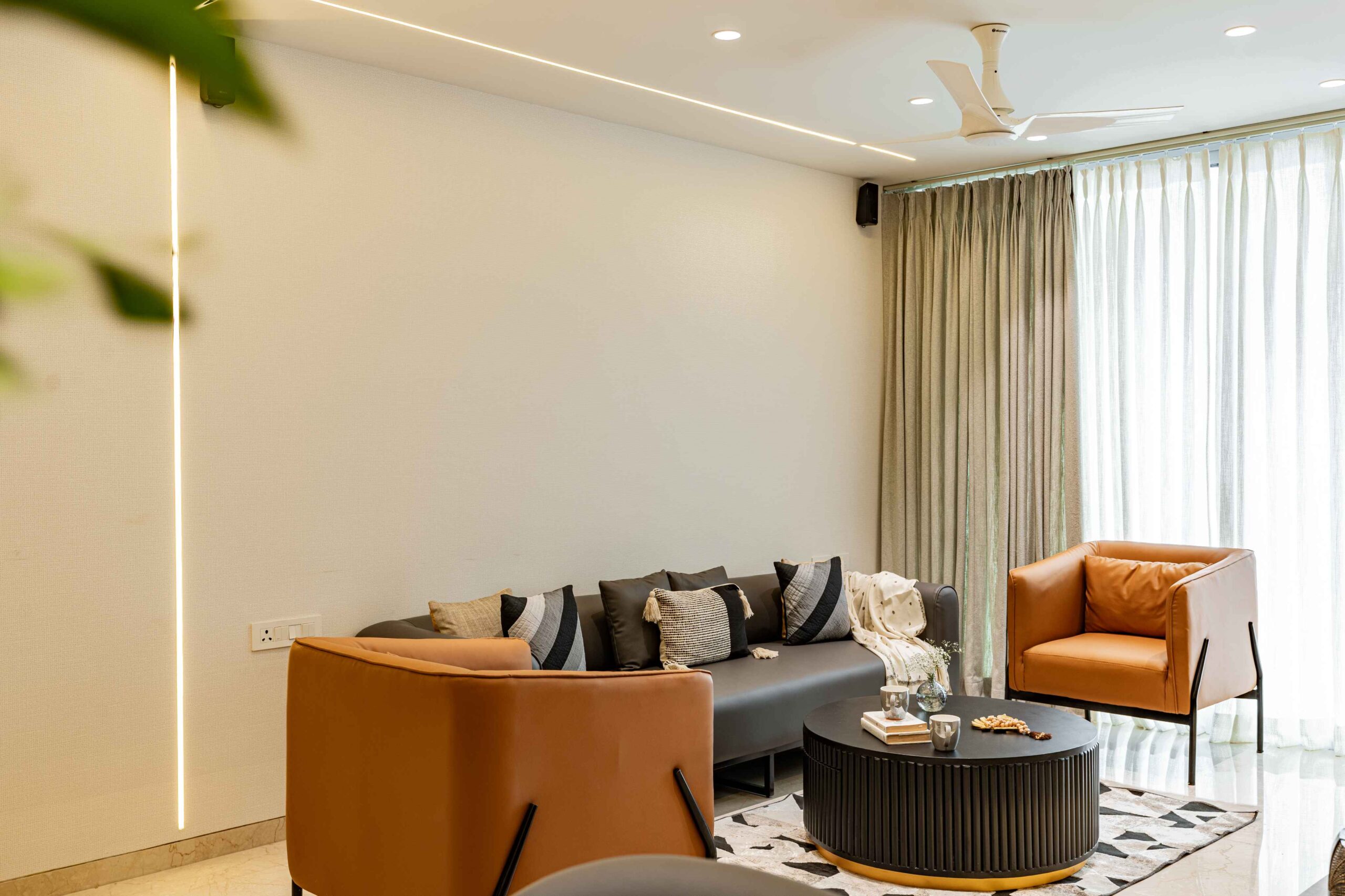 The living room defines the home’s character with a mix of neutral browns, beige, and hints of grey, anchored by an orange sofa that infuses energy into the space. The TV wall in marble adds a layer of opulence, while the track lights highlight key details. A separate mandir unit lends a serene touch, balancing spirituality and style.
