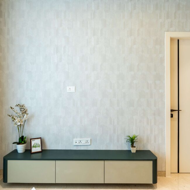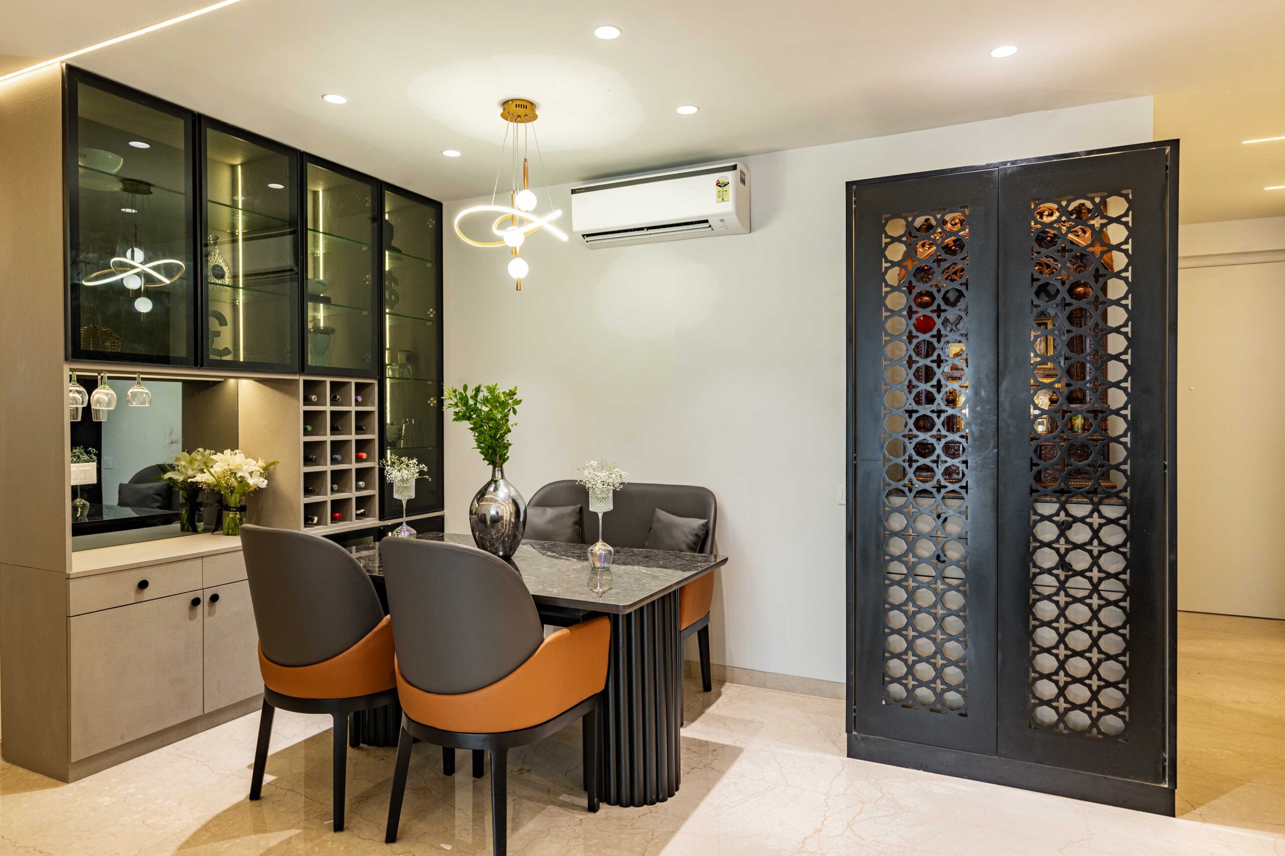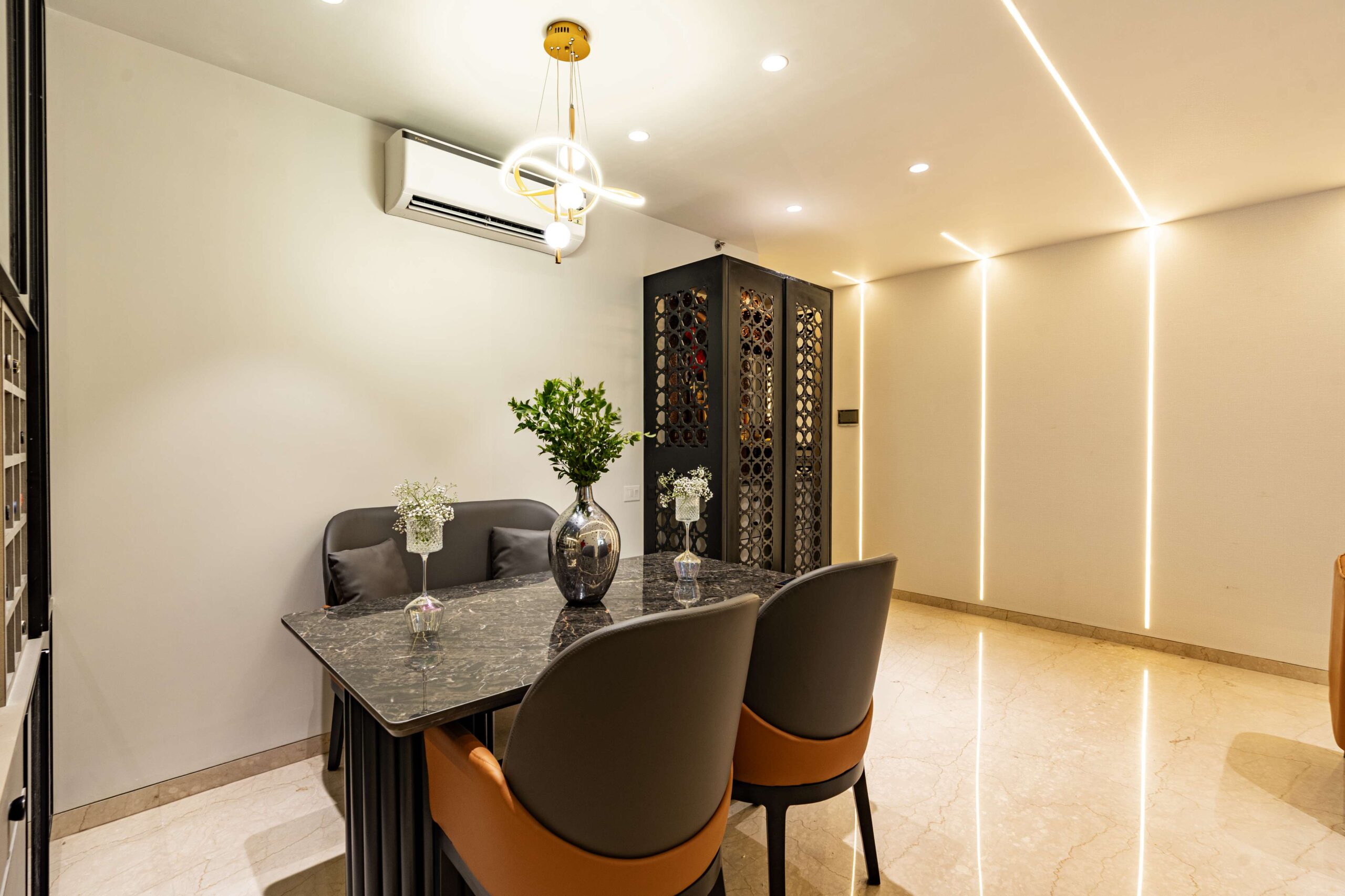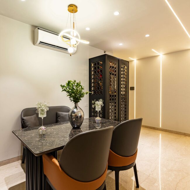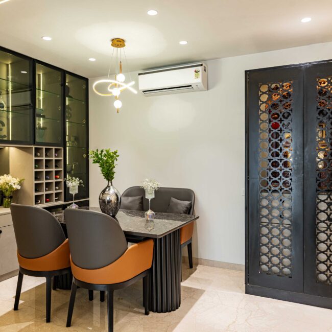 The four-seater seating layout keeps the space open and inviting, perfect for gatherings. A compact bar unit tucked neatly into the layout adds a dash of sophistication. The glass storage in the passage extends the design language — functional, sleek, and reflective of the home’s cohesive aesthetic.
