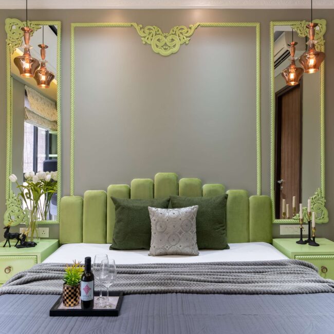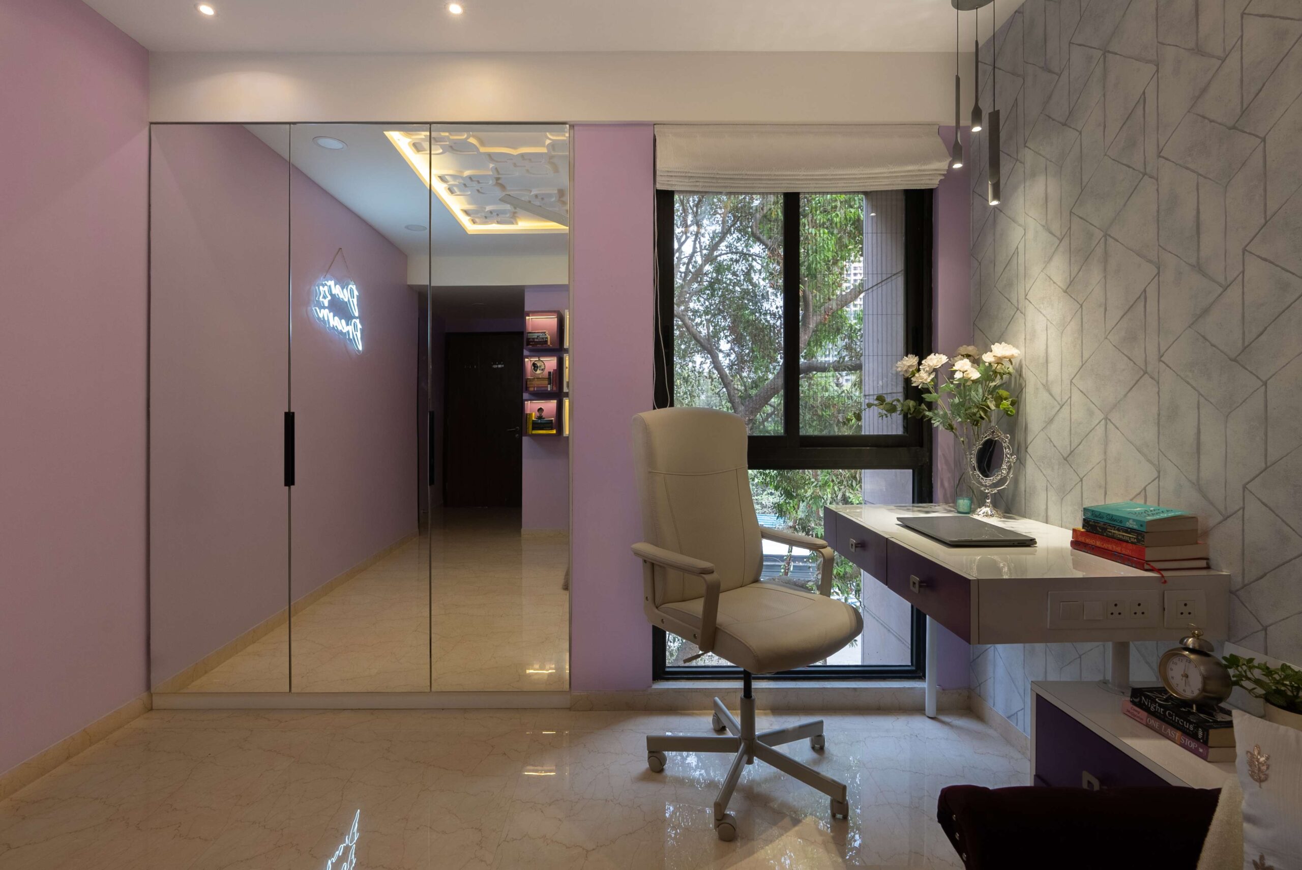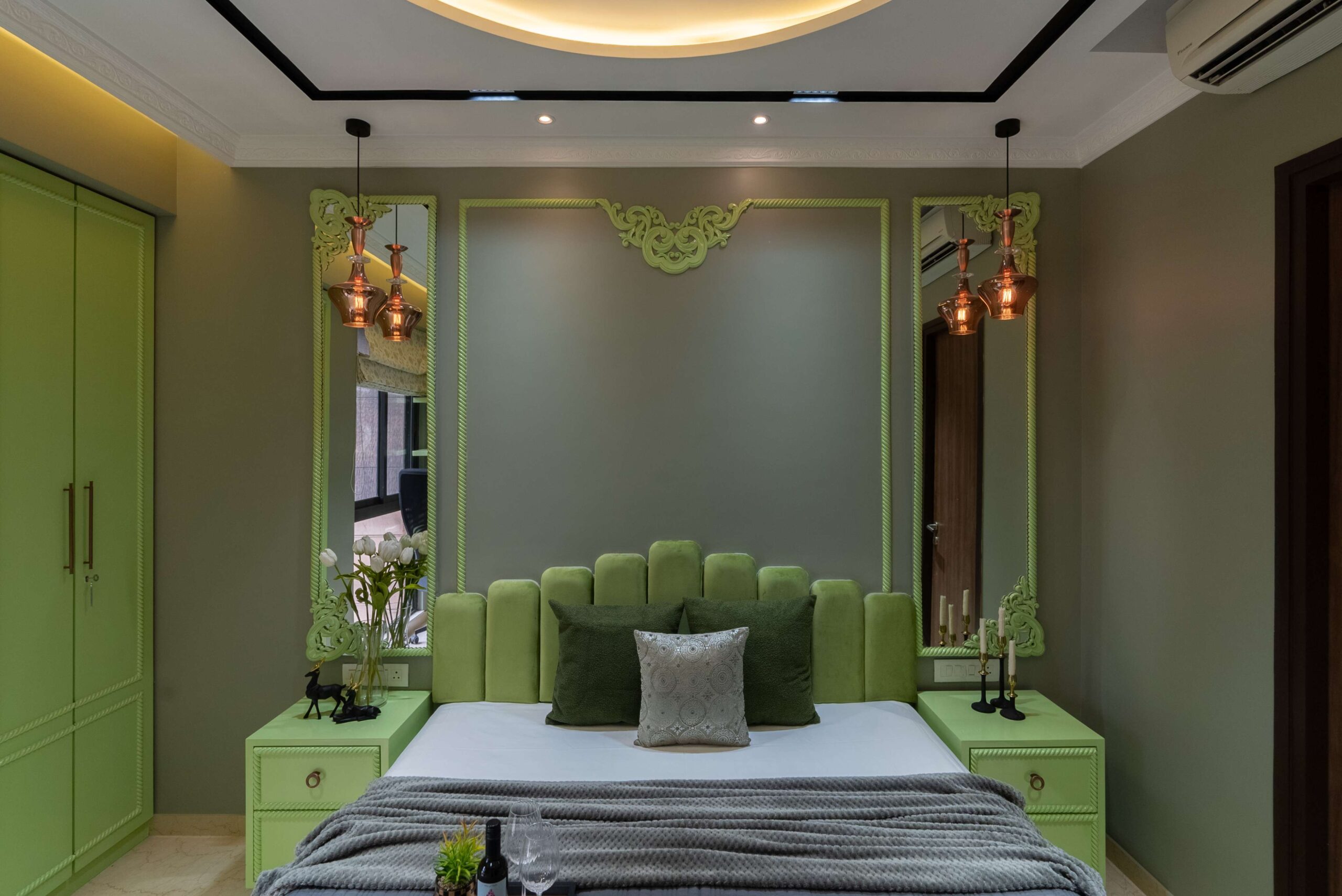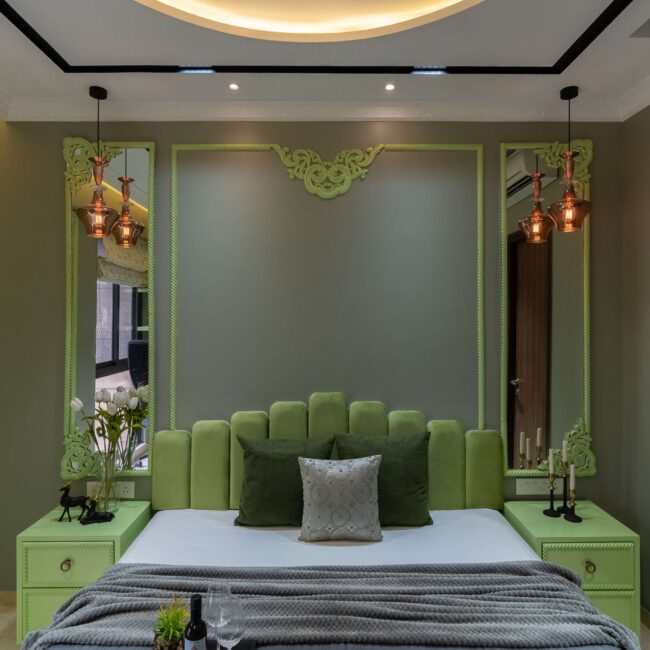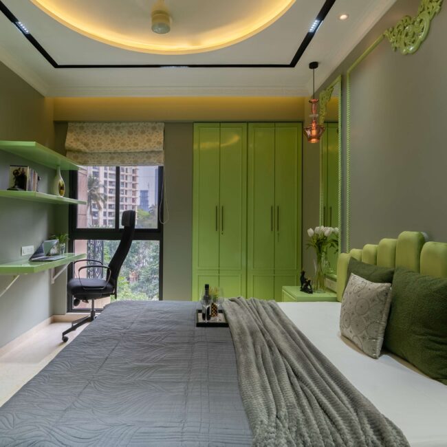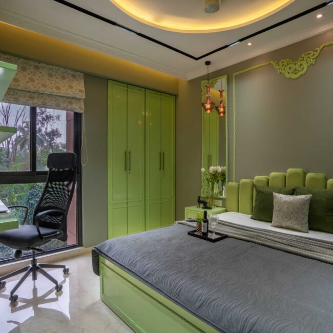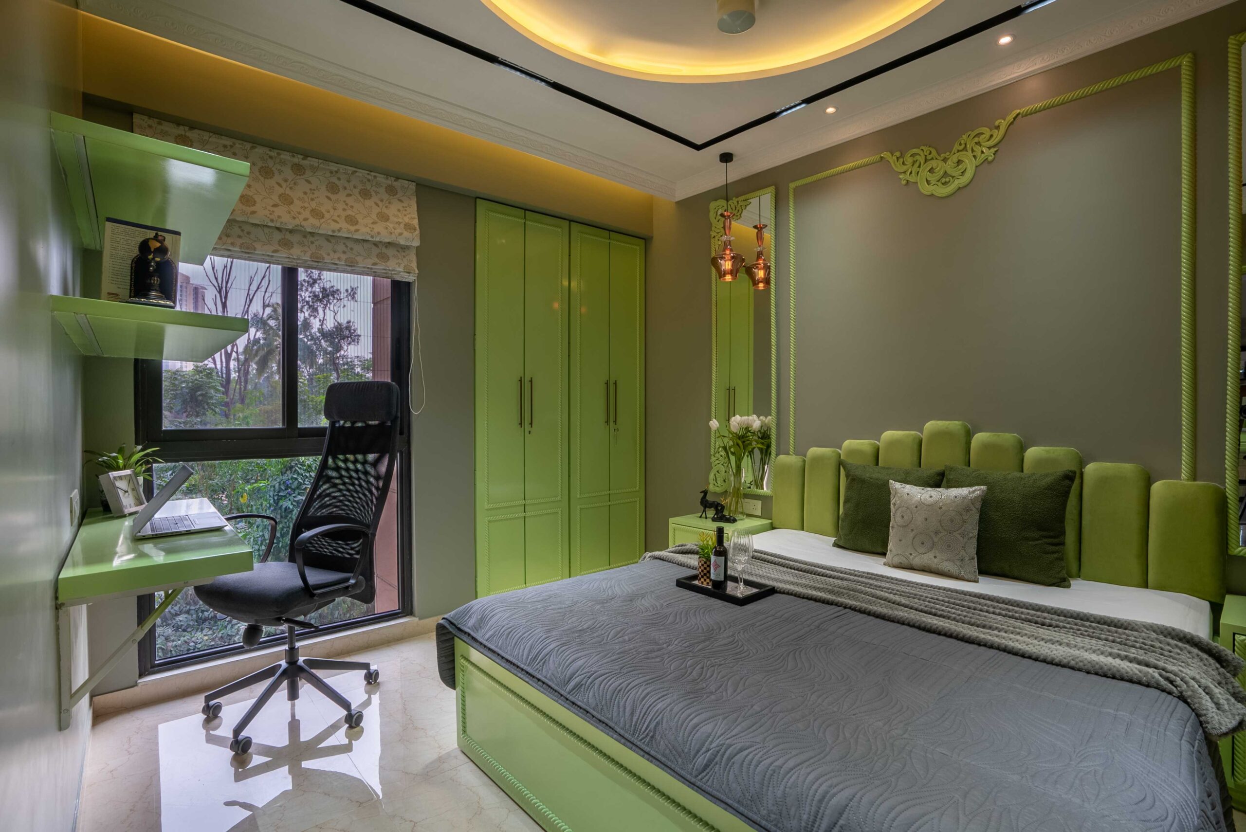 Soft and serene, this pastel green and grey bedroom is designed for balance and focus. A circular fall ceiling becomes the centerpiece, adding subtle dimension and flow to the space. The workstation, seamlessly integrated near the window, ensures natural light fills the space — perfect for productivity and quiet reflection.