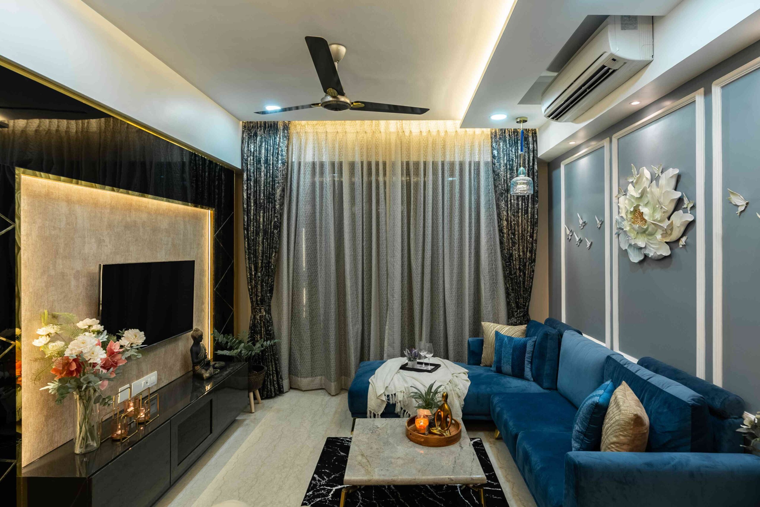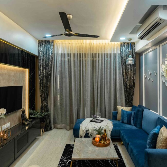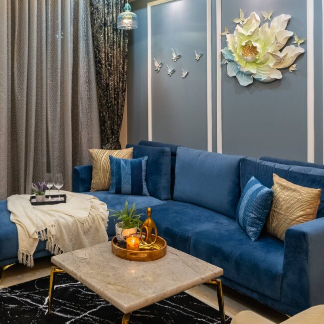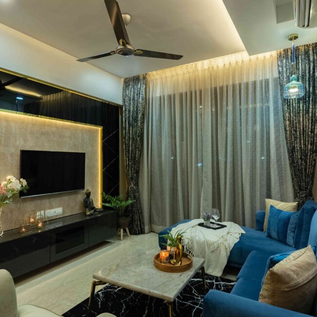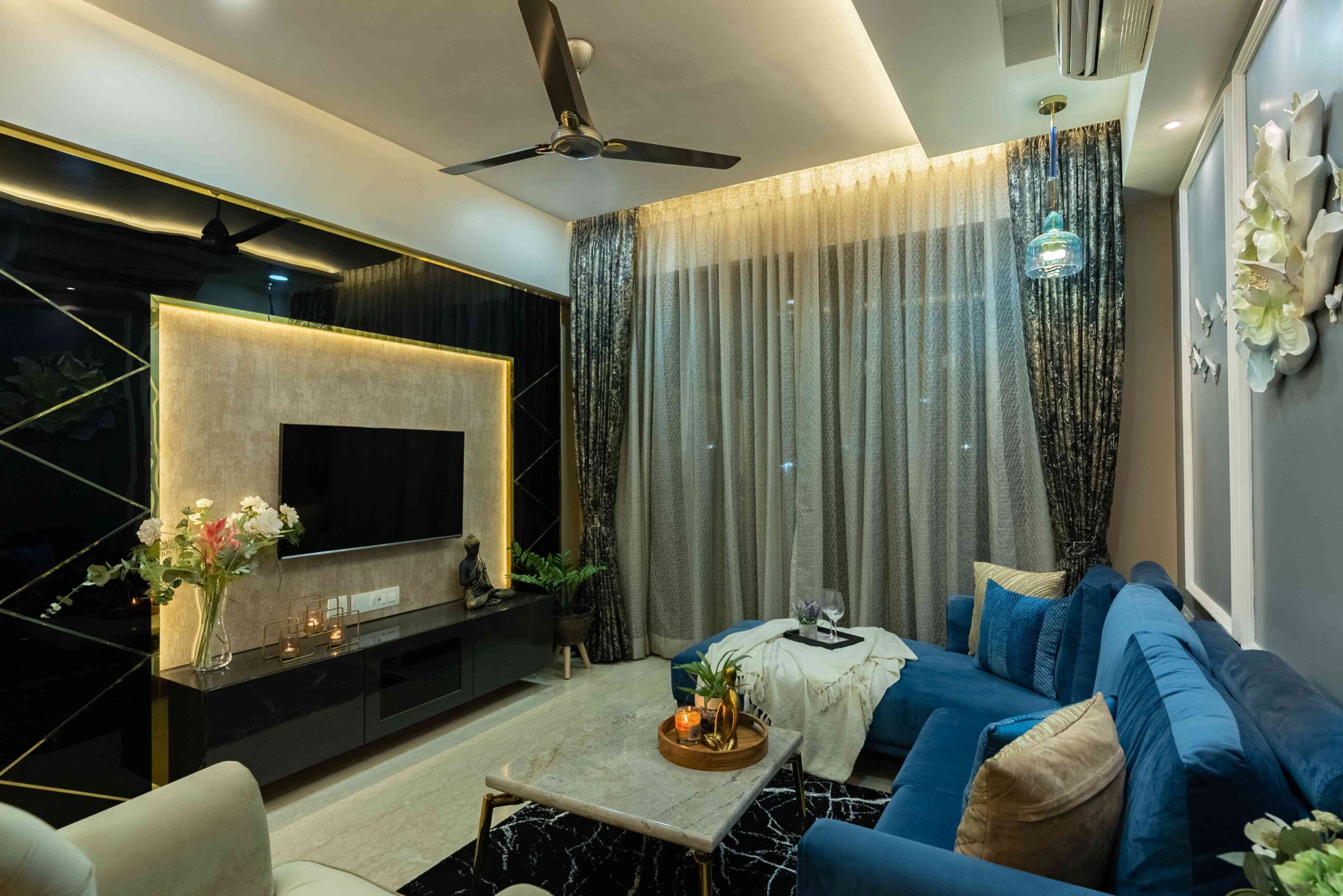 The heart of the home, the living room, sets a tone of understated elegance. Golden lights wash the space in a warm glow, while blue sofas anchor the design with richness and calm. The TV wall, clad in striking black and gold marble, adds a dramatic yet refined contrast — transforming the wall into a statement feature.