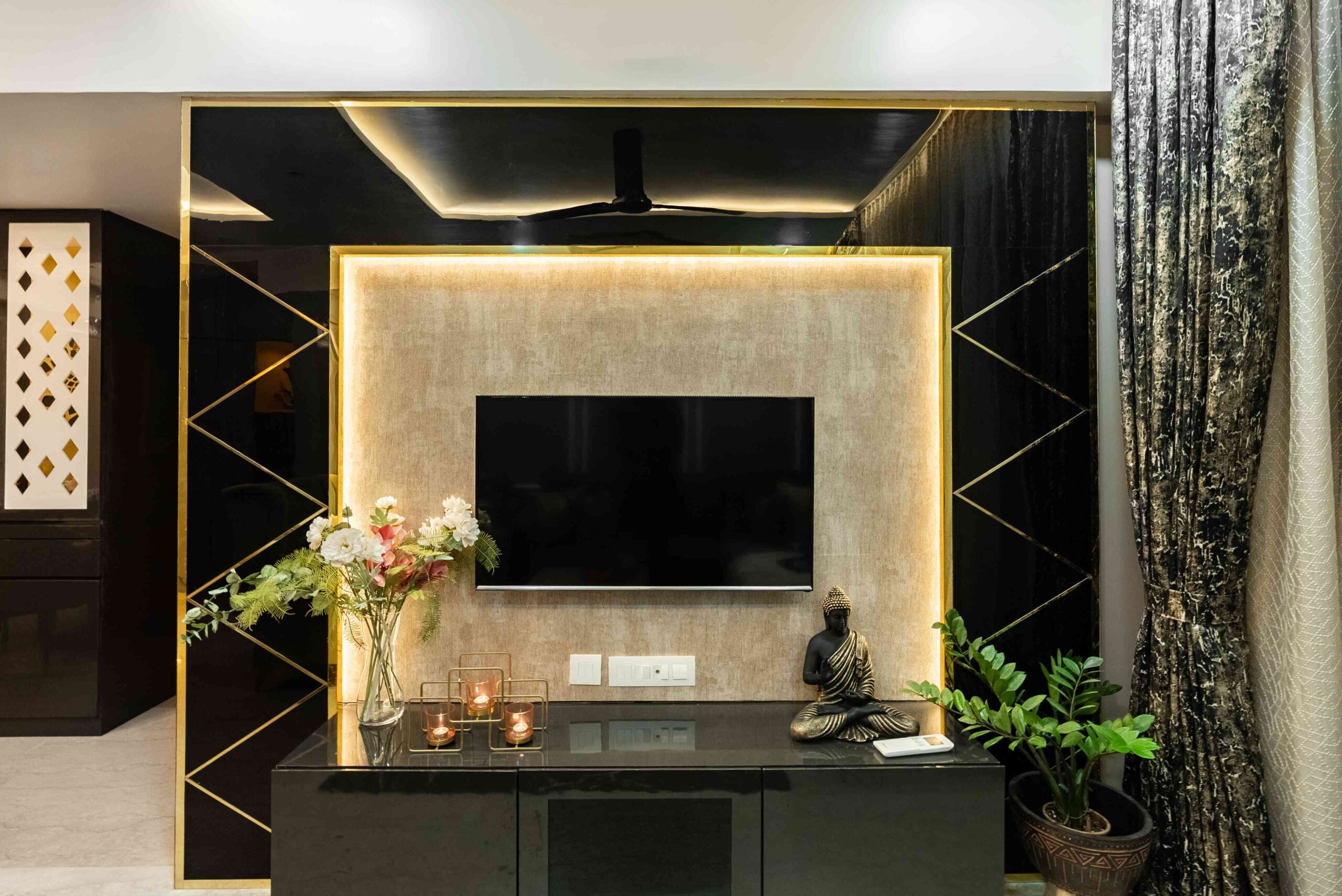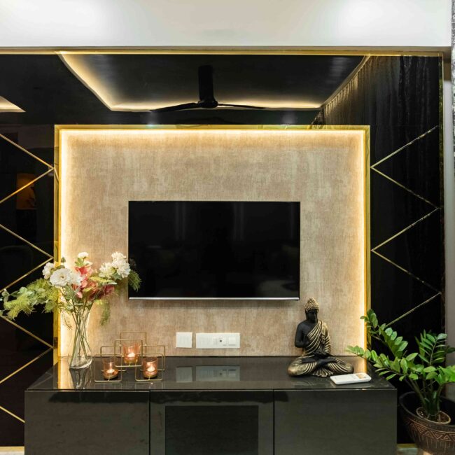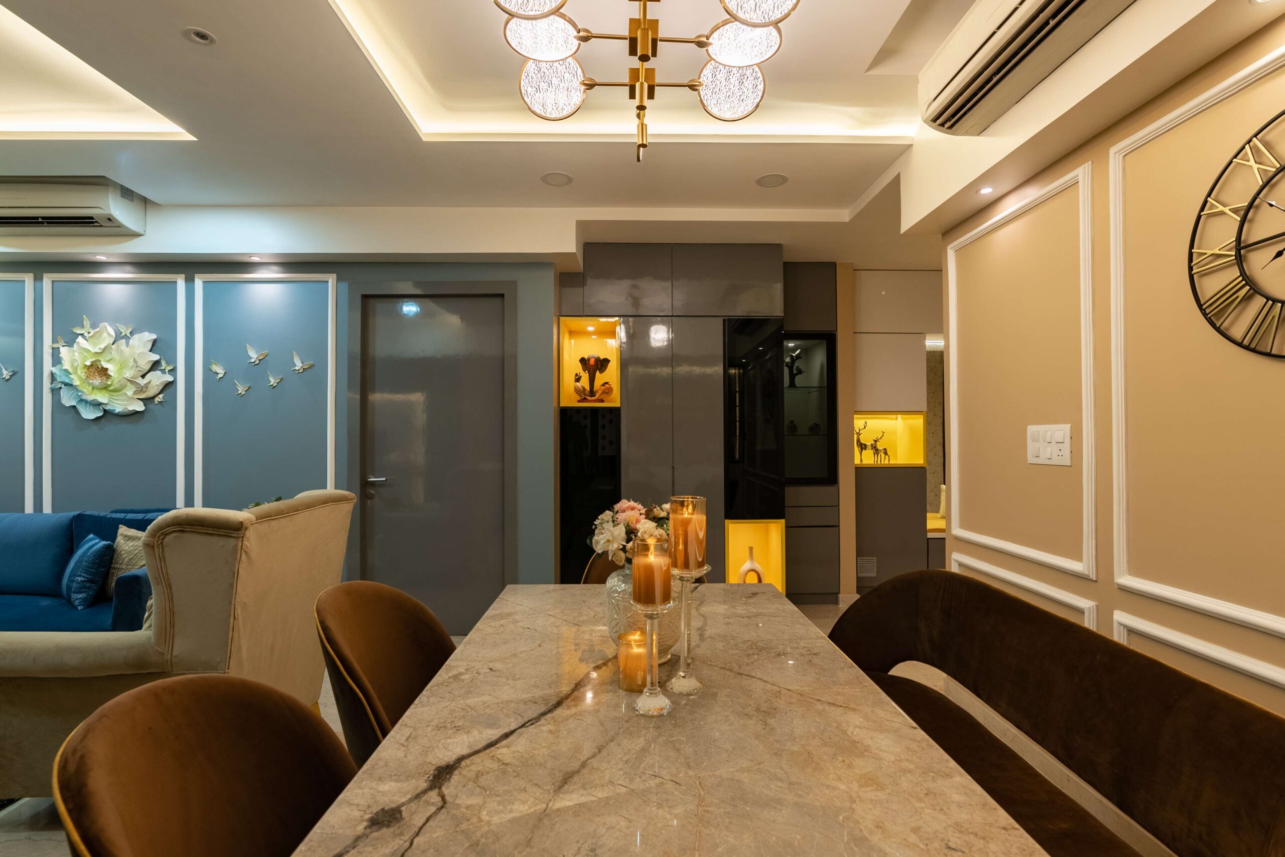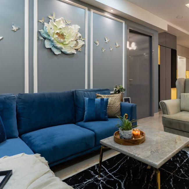 The heart of the home, the living room, sets a tone of understated elegance. Golden lights wash the space in a warm glow, while blue sofas anchor the design with richness and calm. The TV wall, clad in striking black and gold marble, adds a dramatic yet refined contrast — transforming the wall into a statement feature.