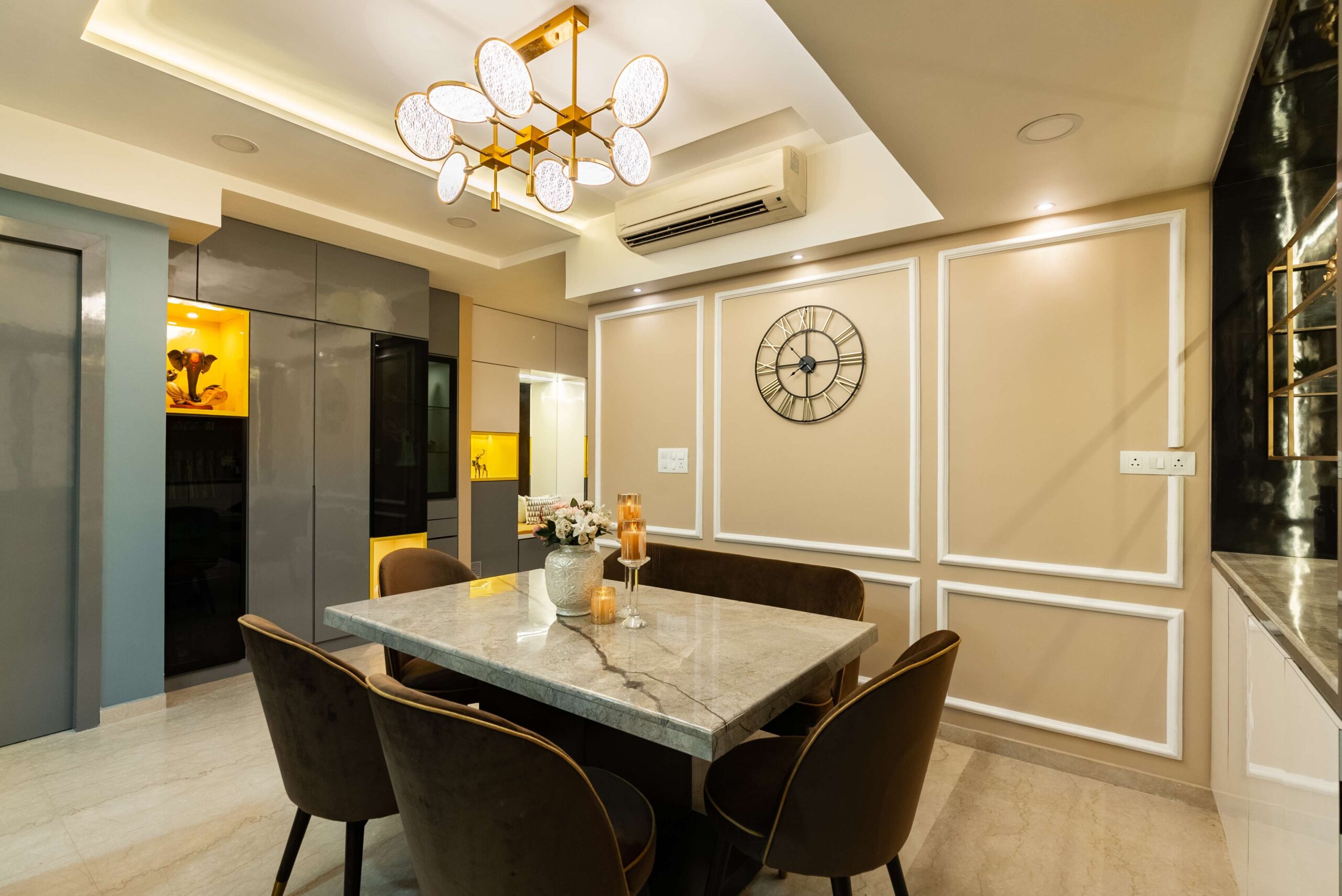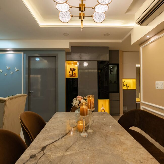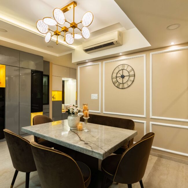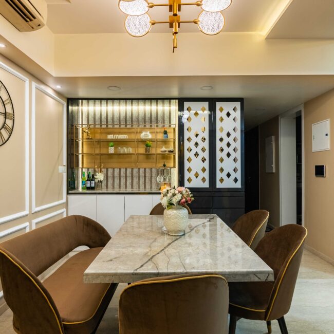 Every element — from the drapery to the textures — has been chosen to create a perfect balance between comfort and sophistication. The dining area, adjoining the living zone, continues the story with brown chairs that blend beautifully with the golden tones, giving the entire space a cohesive, welcoming warmth.